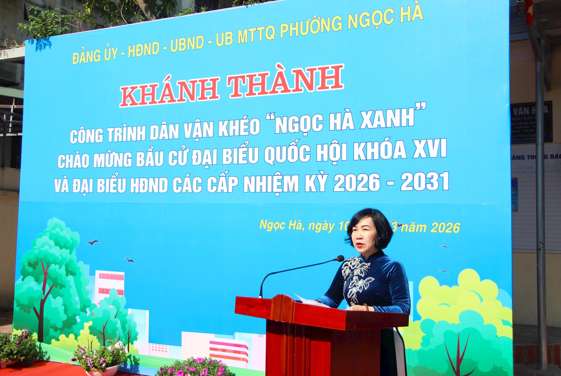Phó Bí thư Thường trực Đảng ủy phường Ngọc Hà Đỗ Thị Duy Nhiên phát biểu tại buổi lễ. Ảnh: MH