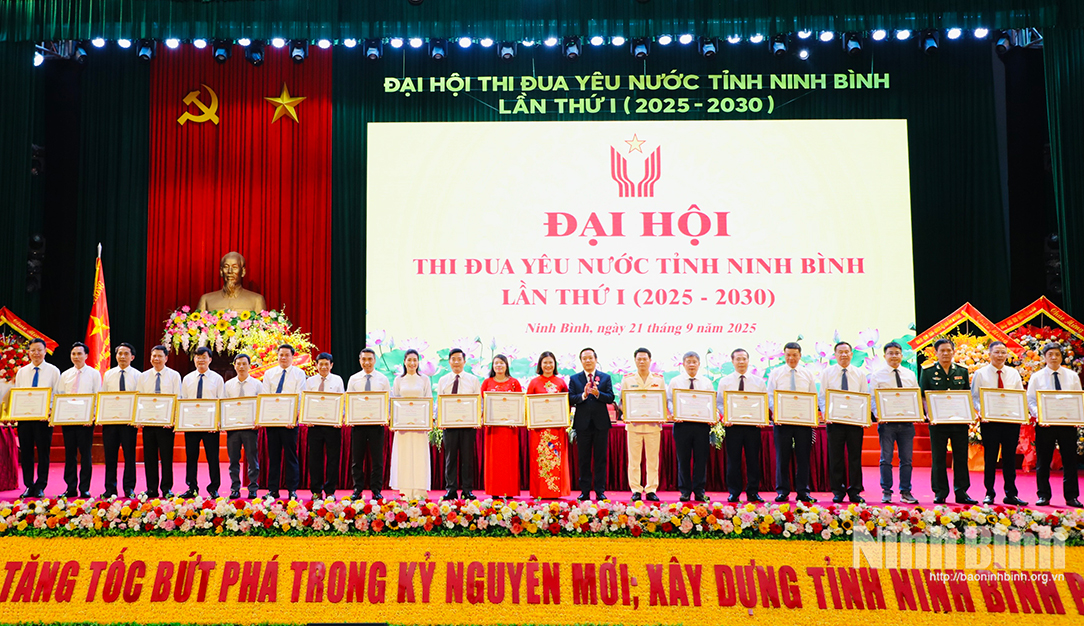 Đồng chí Hoàng Thị Thơm, Phó Bí thư Chi bộ, Tổ trưởng Tổ dân phố An Mông 1 (mặc áo dài đỏ đứng thứ 12 từ bên trái sang) đại diện nhân dân và cán bộ Tổ dân phố nhận Bằng khen của Chủ tịch UBND tỉnh tại Đại hội Thi đua yêu nước tỉnh Ninh Bình lần thứ I (giai đoạn 2025 - 2030). Ảnh: Đức Lam.