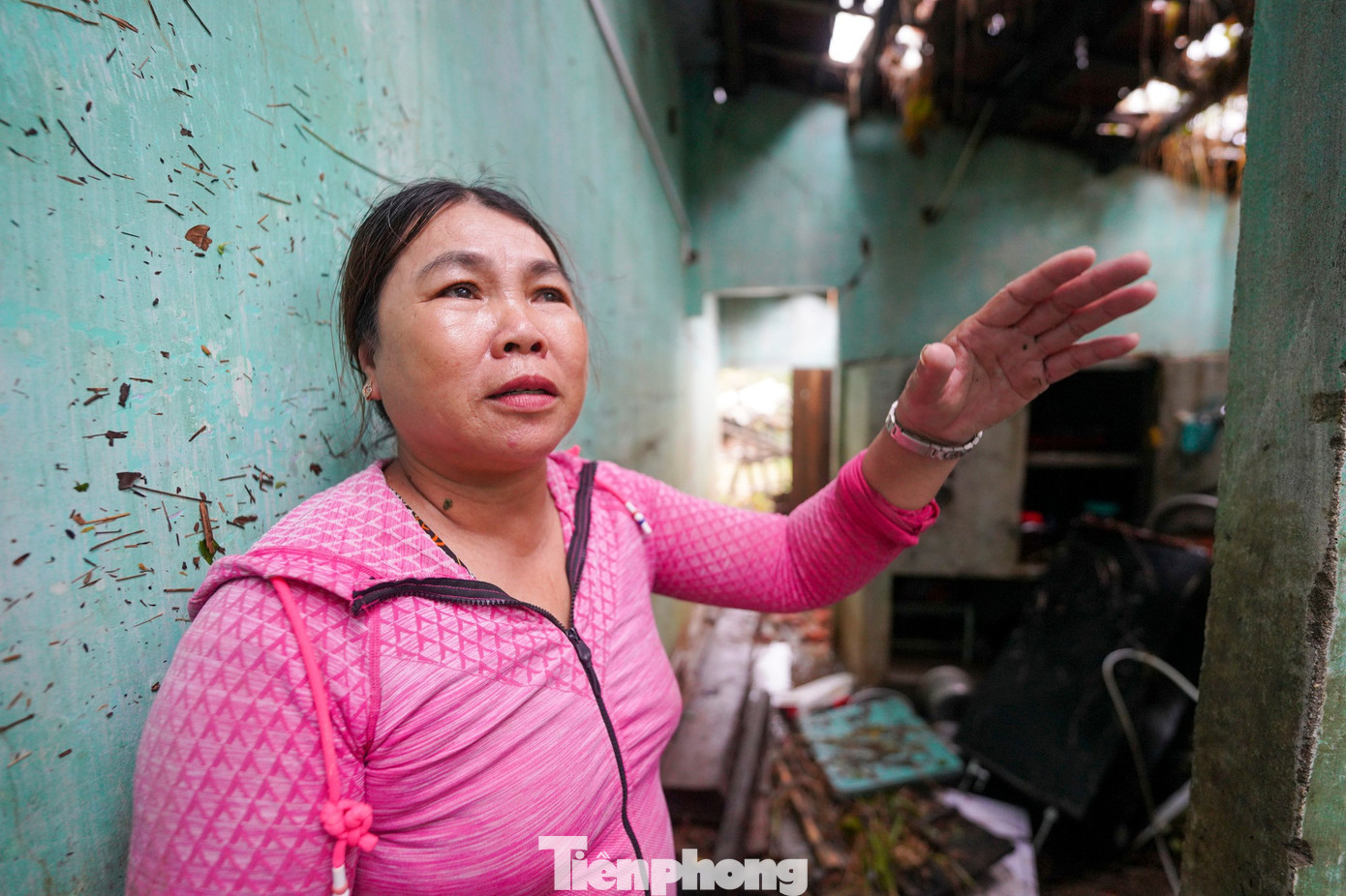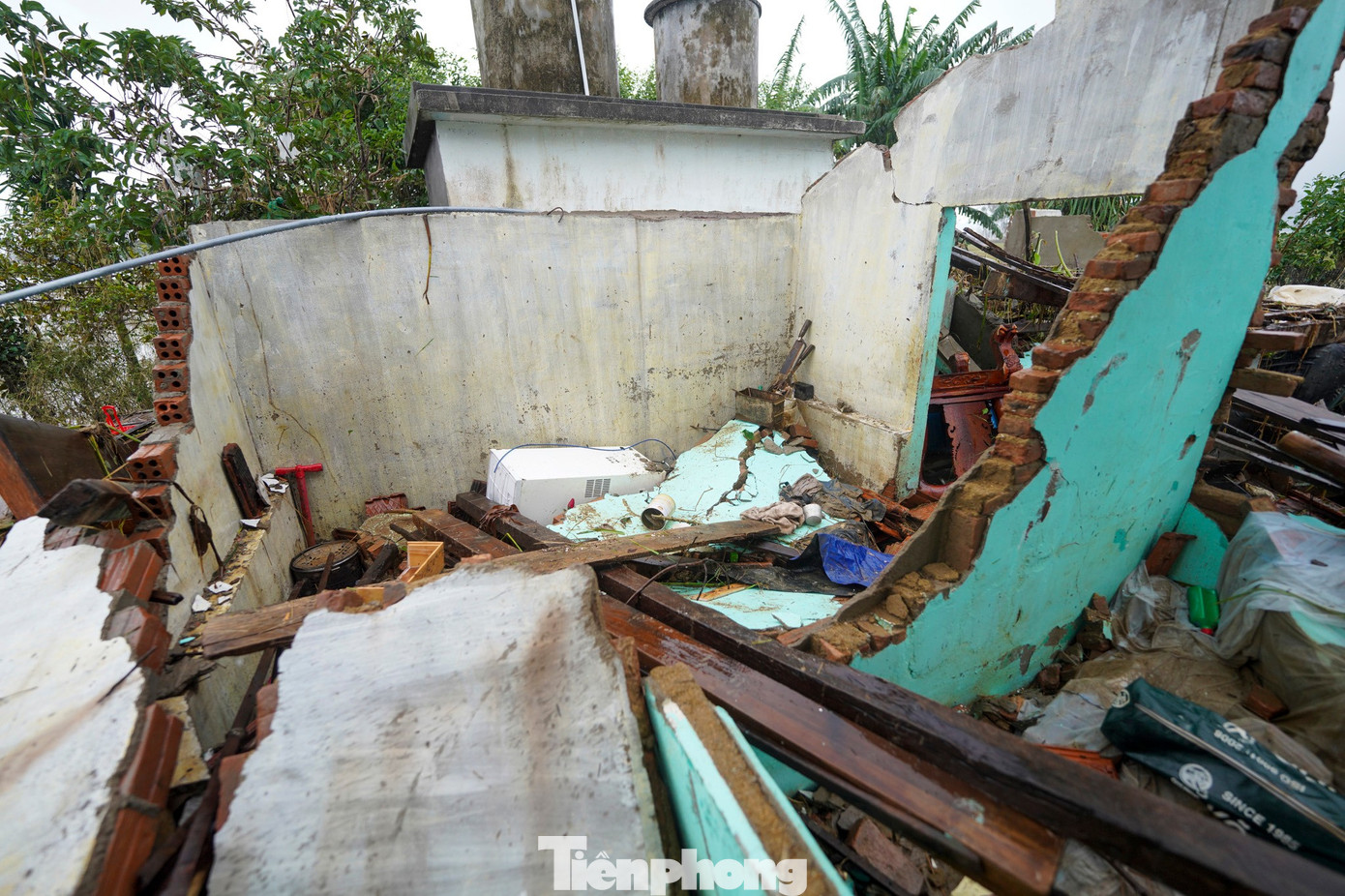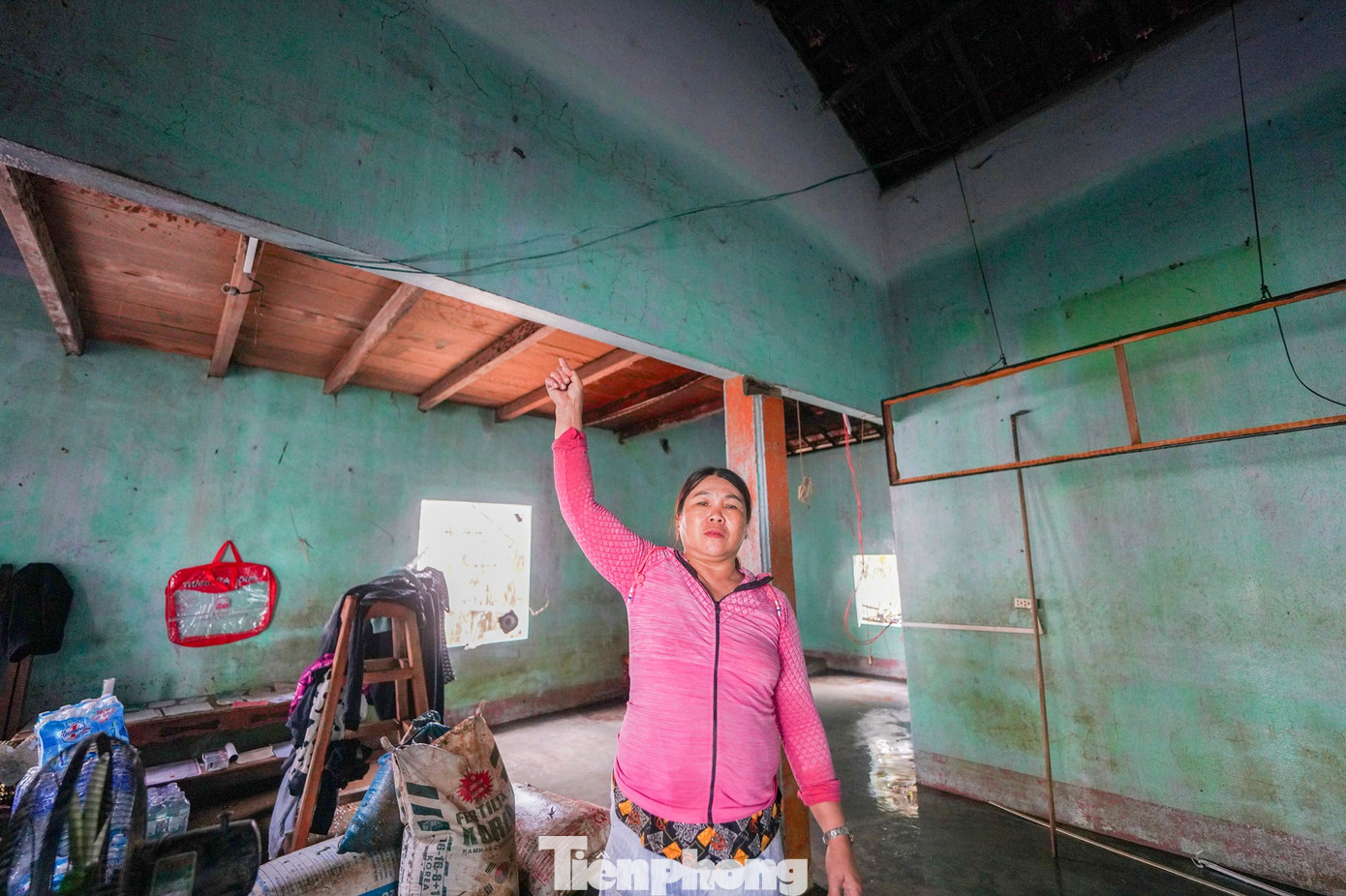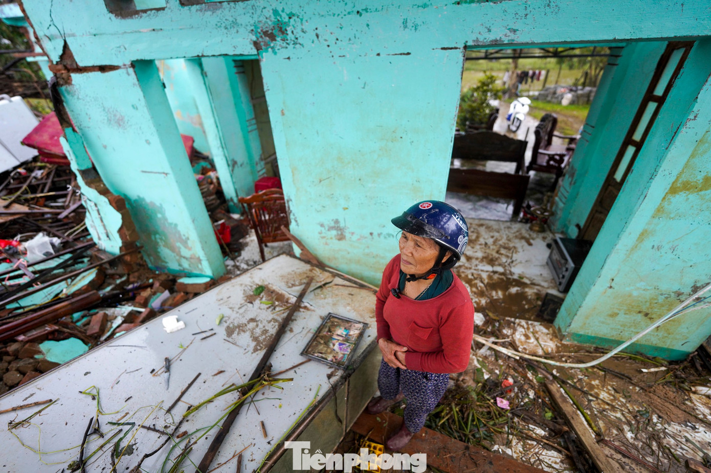 Bà Nguyễn Thị Thành, 69 tuổi, run run đứng trước nền nhà không còn hình dạng. Mảng tường nứt toác, mái nhà sập hoàn toàn đè lên vật dụng.