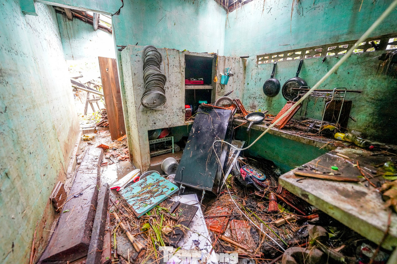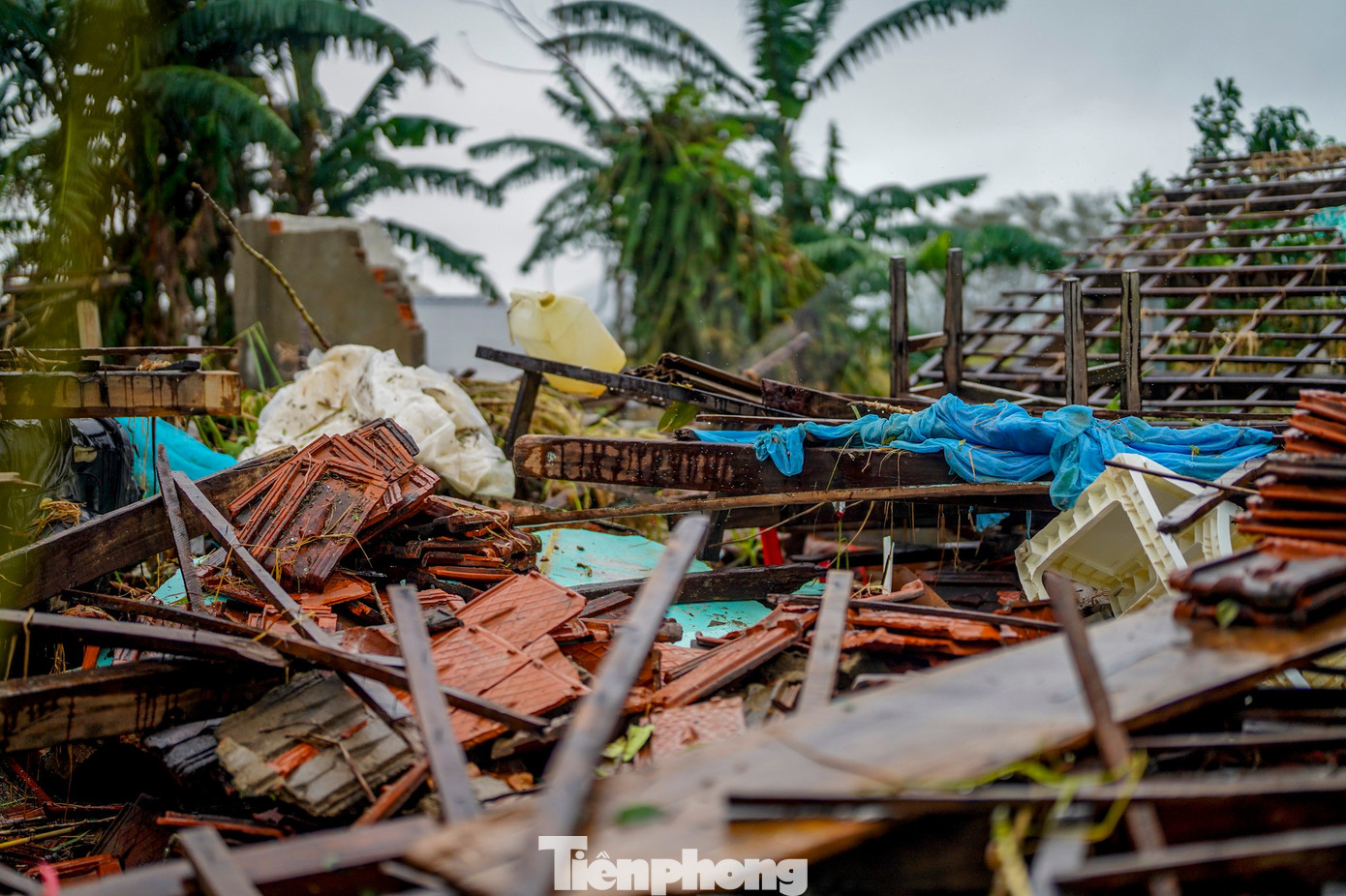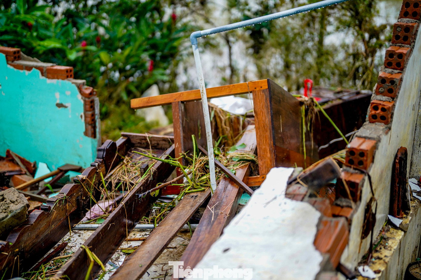 Bà Nguyễn Thị Thành, 69 tuổi, run run đứng trước nền nhà không còn hình dạng. Mảng tường nứt toác, mái nhà sập hoàn toàn đè lên vật dụng.