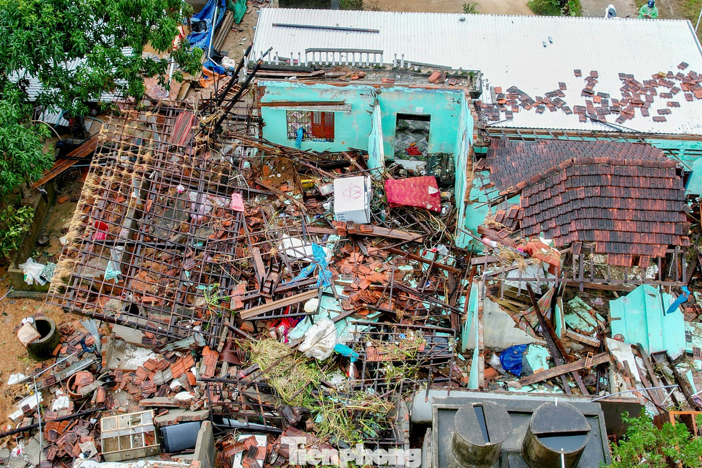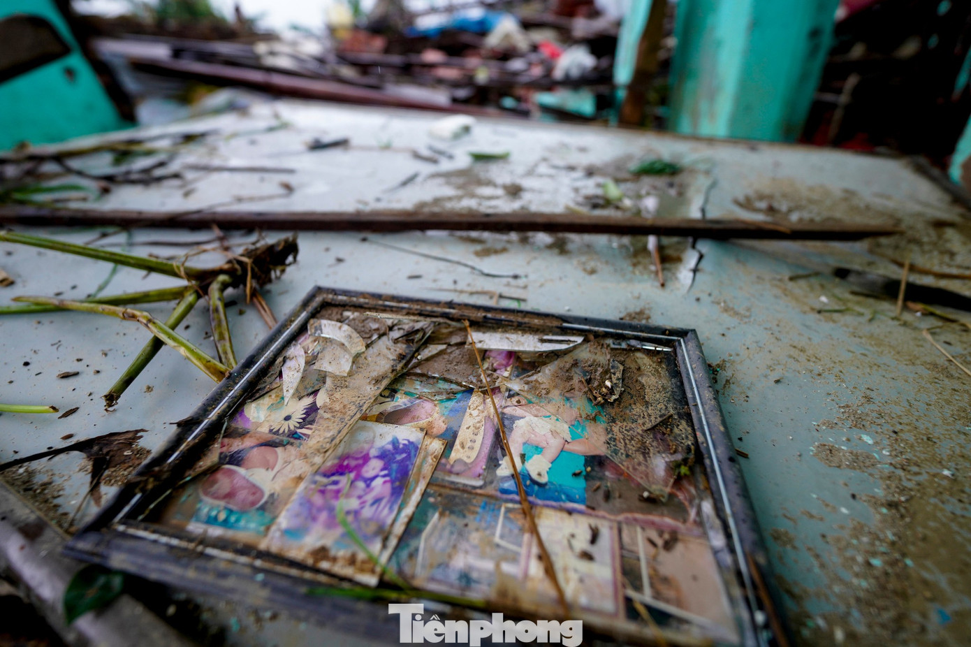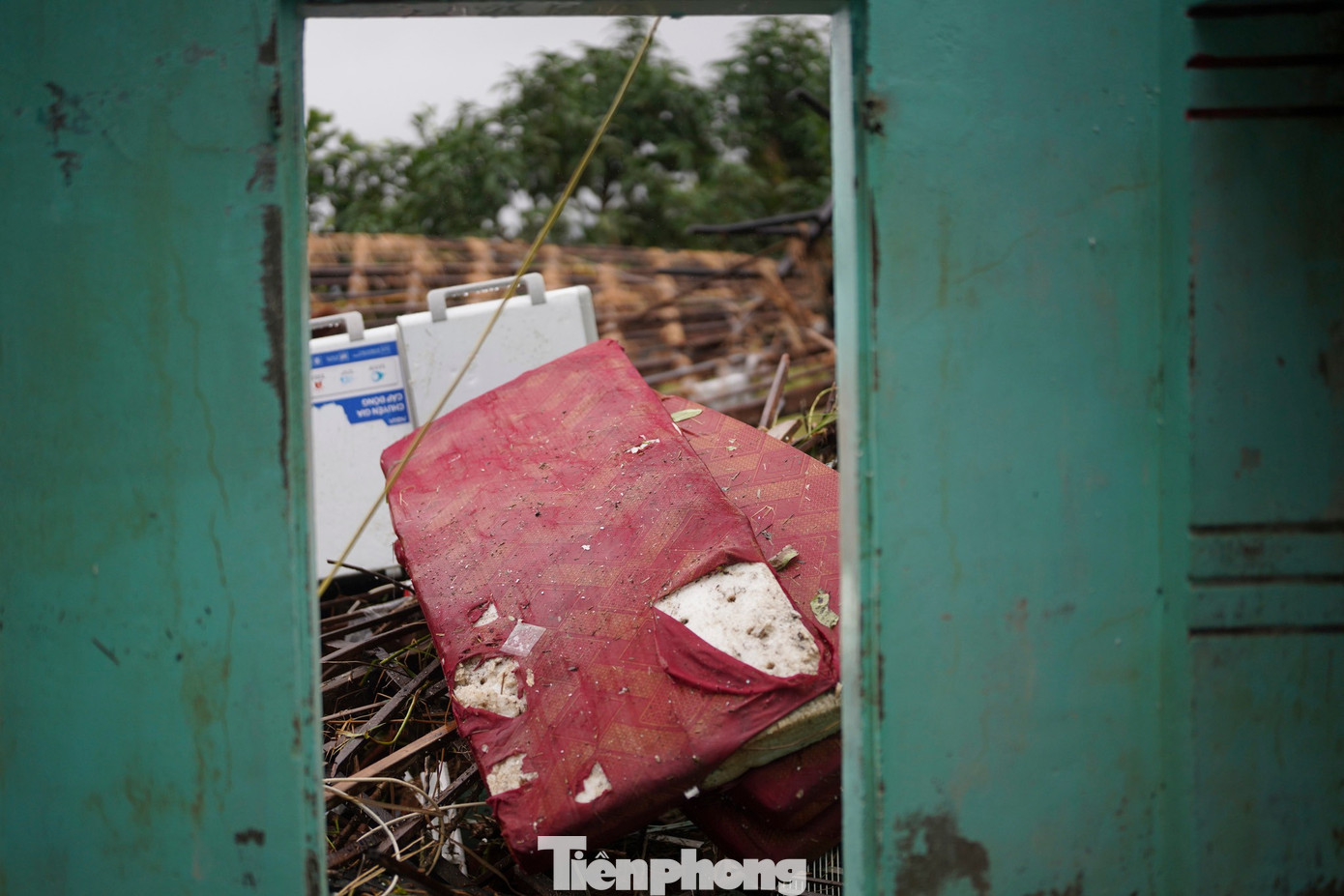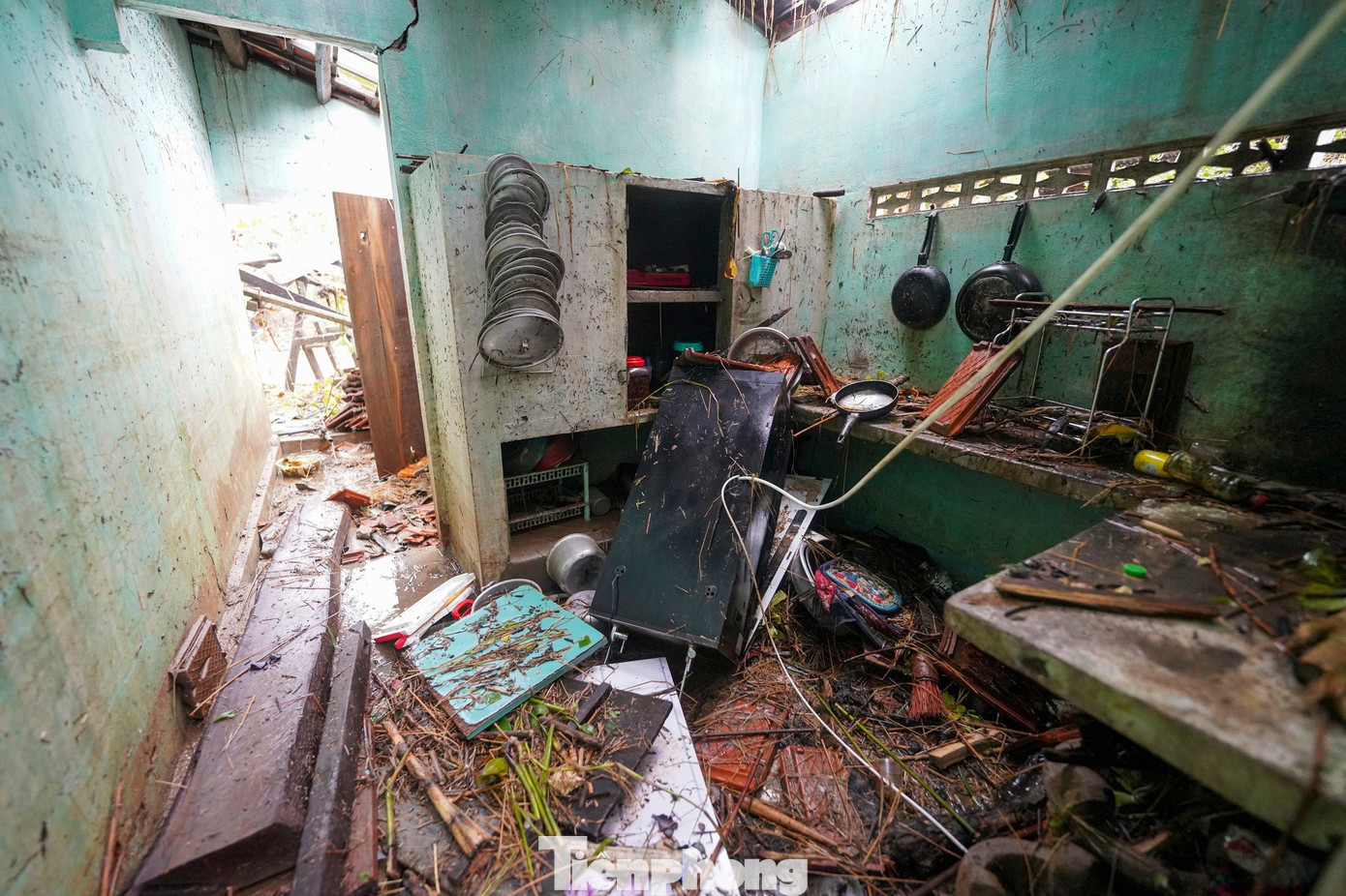 Bà Nguyễn Thị Thành, 69 tuổi, run run đứng trước nền nhà không còn hình dạng. Mảng tường nứt toác, mái nhà sập hoàn toàn đè lên vật dụng.