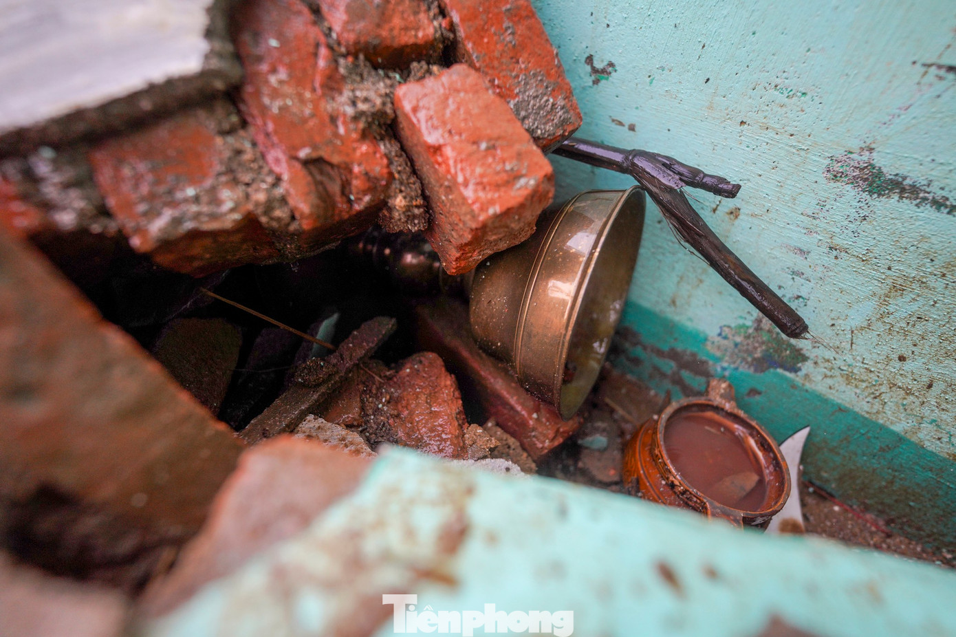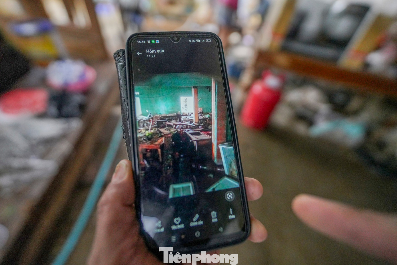 Nơi từng đặt bàn thờ gia tiên giờ chỉ còn bùn và mảng tường loang dấu nước. Nước lũ dâng cao đến gần mái khiến cả gia đình phải leo lên nhà và chờ lực lượng đến cứu hộ.