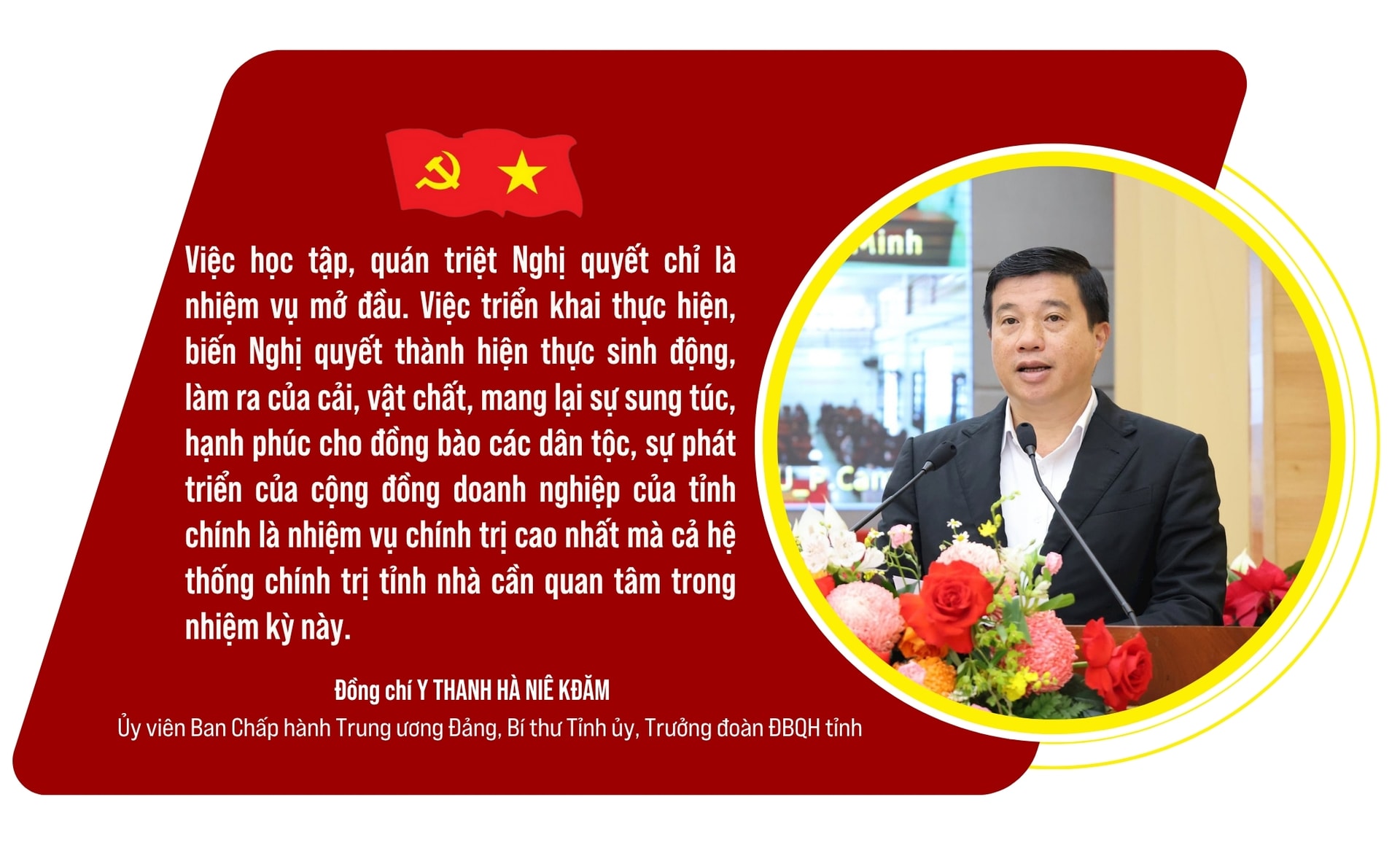 Các đồng chí: Y Thanh Hà Niê Kđăm, Ủy viên Ban Chấp hành Trung ương Đảng, Bí thư Tỉnh ủy, Trưởng đoàn ĐBQH tỉnh; Đặng Hồng Sỹ, Phó Bí thư Thường trực Tỉnh ủy; Hồ Văn Mười, Phó Bí thư Tỉnh ủy, Chủ tịch UBND tỉnh; Bùi Thắng, Phó Bí thư Tỉnh ủy; Lưu Văn Trung, Phó Bí thư Tỉnh ủy dự và chủ trì Hội nghị.