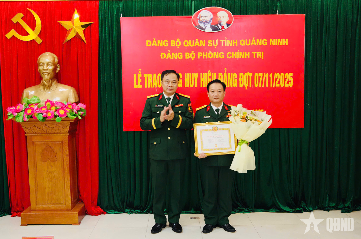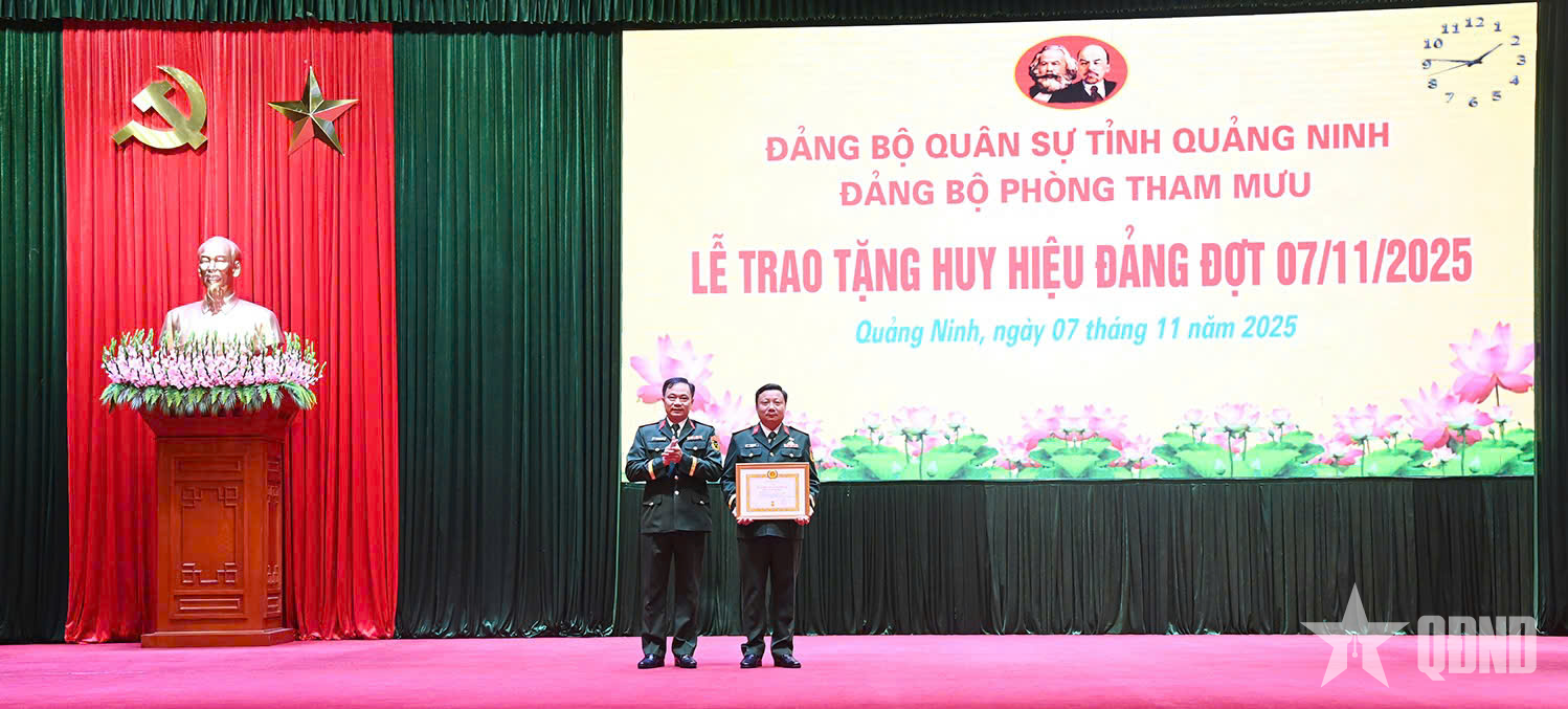 Cũng trong chiều 7-11, thừa ủy quyền của Tỉnh ủy Quảng Ninh, Đại tá Hoàng Văn Thuyết, Tỉnh ủy viên, Phó bí thư Thường trực Đảng ủy, Chính ủy Bộ CHQS tỉnh trao tặng huy hiệu 30 năm tuổi Đảng cho Thượng tá Phạm Bình Quân, Bí thư Đảng ủy Phòng Chính trị, Phó Chủ nhiệm Chính trị Bộ CHQS tỉnh.