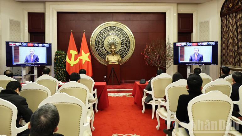 Điểm cầu trực tuyến Hội nghị toàn quốc nghiên cứu, học tập, quán triệt và triển khai thực hiện Nghị quyết Đại hội XIV của Đảng tại trụ sở Đại sứ quán Việt Nam tại Trung Quốc.