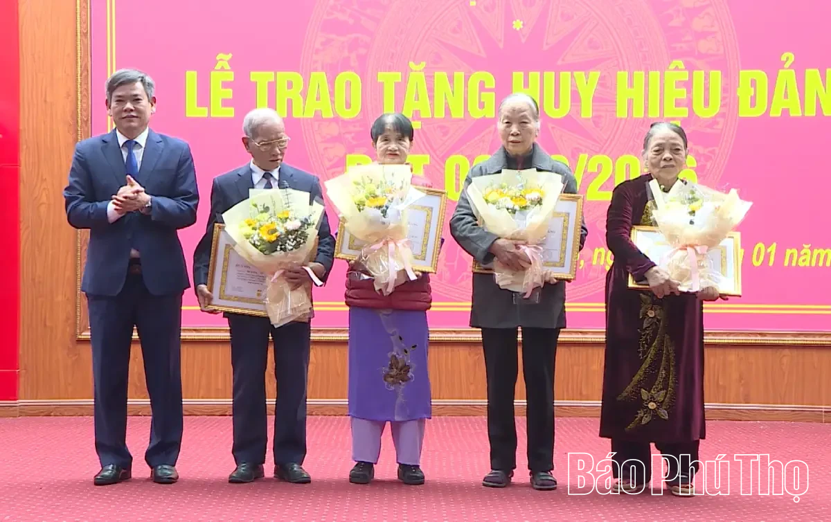 Đồng chí Nguyễn Quang Anh - TUV, Bí thư Đảng ủy, Chủ tịch HĐND xã Lâm Thao trao Huy hiệu 60 năm tuổi Đảng cho các đảng viên.