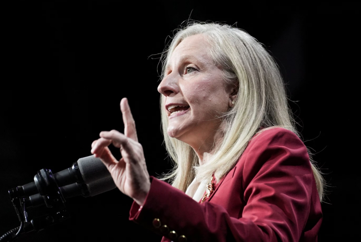 Bà Abigail Spanberger có bài phát biểu chiến thắng trước ứng cử viên Cộng hòa Earle-Sears trong cuộc đua giành chức Thống đốc Virginia ngày 4/11. Ảnh: Reuters