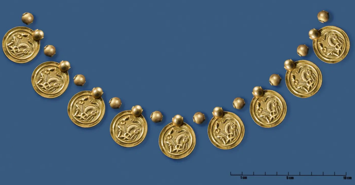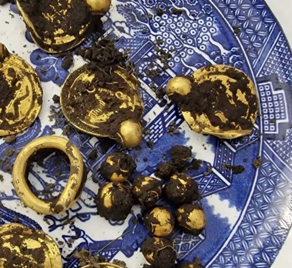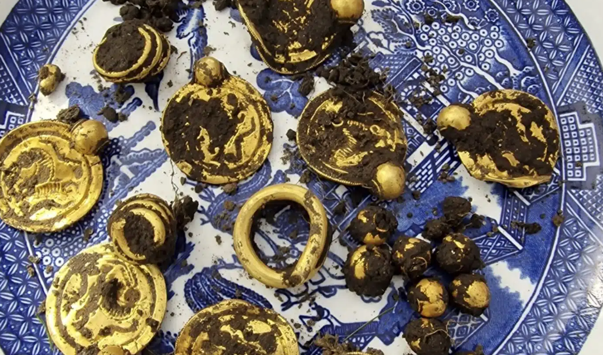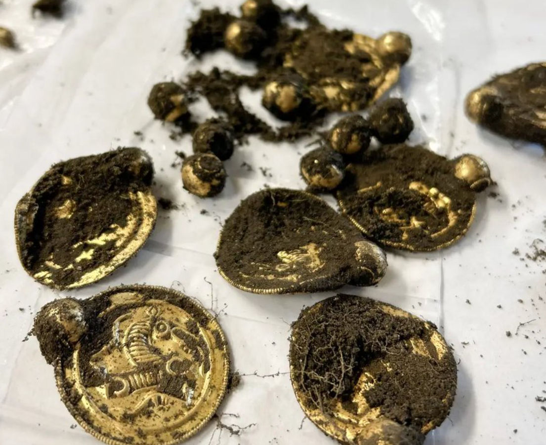 Ông Erlend Bore đã khai quật được chín mặt dây chuyền vàng chạm khắc, mười viên ngọc trai vàng và ba chiếc nhẫn vàng. Ảnh: @Erlend Bore.