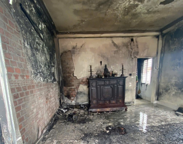 Vụ cháy gây hư hỏng tủ thờ và gây bong tróc nhiều mảng tường nhà do nhiệt lượng gây ra.