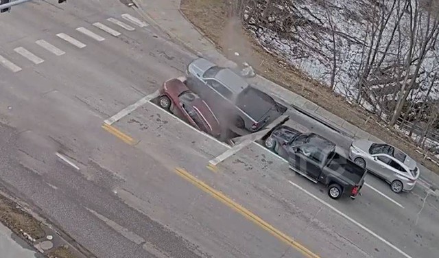Đoạn clip ghi lại cho thấy hai chiếc xe đang dừng đèn đỏ thì mặt đường bên dưới đột ngột sụp xuống vào chiều ngày 24/2, tại Omaha, Mỹ. Hai chiếc xe địa hình phía sau nhanh chóng lùi lại để tránh bị rơi xuống.