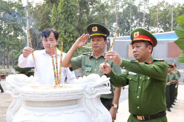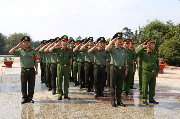 Trong không khí trang nghiêm, đoàn đã dành phút mặc niệm bày tỏ sự tri ân sâu sắc đến các Anh hùng - Liệt sĩ đã hy sinh vì sự nghiệp giải phóng dân tộc, thống nhất đất nước. Đoàn đã dâng hương trước Tượng đài bảo vệ an ninh Tổ quốc, Bia Chiến thắng, nơi ghi danh hơn 14.000 cán bộ, chiến sĩ CAND Việt Nam đã anh dũng hy sinh vì độc lập dân tộc, thống nhất Tổ quốc; dâng hương trước Tượng đài Bác Hồ, Tượng đài cố Bộ trưởng Phạm Hùng tại Khu di tích lịch sử, văn hóa Ban An ninh Trung ương Cục miền Nam.