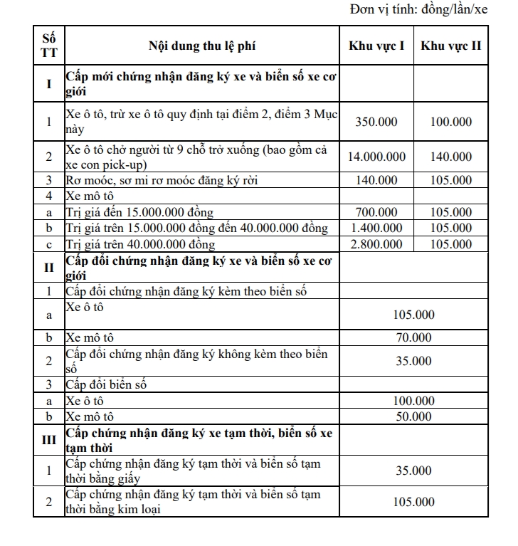 Dự thảo Thông tư cũng nêu rõ, tổ chức, cá nhân có trụ sở, nơi cư trú ở khu vực nào thì nộp lệ phí cấp chứng nhận đăng ký, biển số phương tiện giao thông theo mức thu lệ phí quy định tương ứng với khu vực đó.