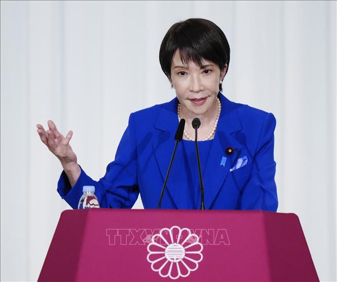 Bà Sanae Takaichi phát biểu sau khi đắc cử chức Chủ tịch đảng LDP ngày 4/10/2025. Ảnh: Kyodo/TTXVN