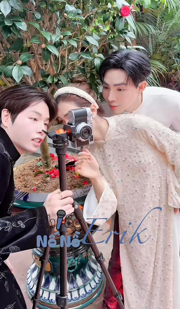 Mới đây, một đoạn clip hậu trường phía sau cảnh cả nhà đoàn viên được chia sẻ lên mạng xã hội đã nhanh chóng thu hút sự chú ý. Nếu như Hòa Minzy chỉn chu dùng chân máy để canh góc chụp ảnh gia đình, thì Erik lại khiến nhiều netizen bật cười khi đặt điện thoại ở gốc cây để quay clip, chụp ảnh khoảnh khắc quây quần.