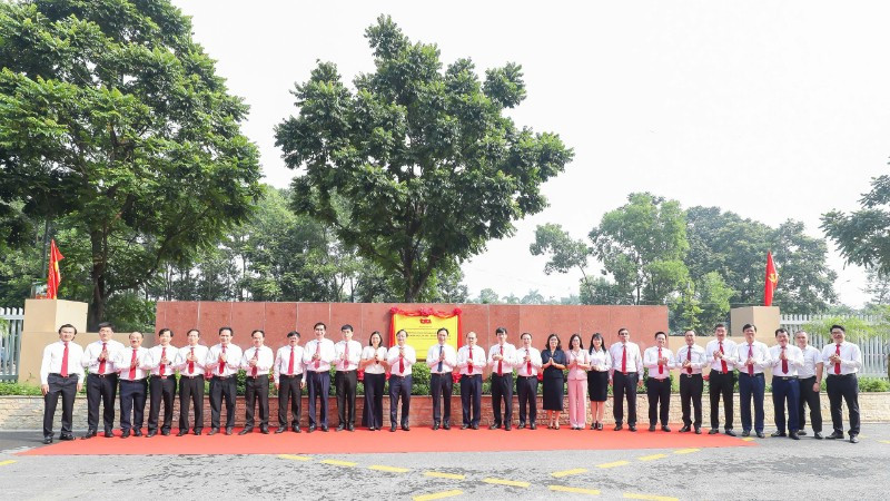 Các đại biểu thực hiện nghi thức gắn biển công trình Trụ sở Trung tâm Dữ liệu Agribank chào mừng Đại hội đại biểu Đảng bộ Chính phủ lần thứ I, nhiệm kỳ 2025-2030.