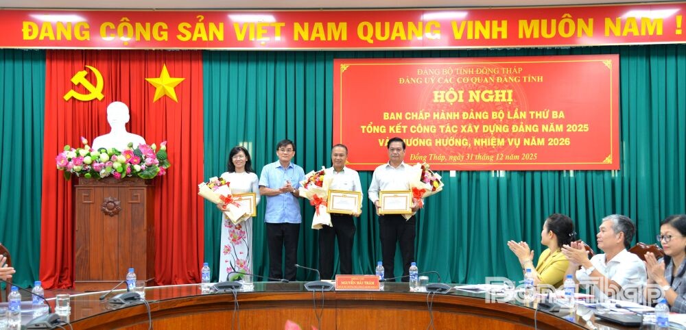 Dịp này, Ban Thường vụ Đảng ủy các cơ quan Đảng tỉnh trao tặng Giấy khen cho 1 Chi bộ đạt “Hoàn thành xuất sắc nhiệm vụ” tiêu biểu 5 năm liền; 3 đảng viên đạt “Hoàn thành xuất sắc nhiệm vụ” 5 năm liền; 2 tổ chức cơ sở đảng đạt tiêu chuẩn “Hoàn thành xuất sắc nhiệm vụ” tiêu biểu; 2 tổ chức cơ sở đảng có thành tích trong công tác xây dựng Đảng năm 2025.