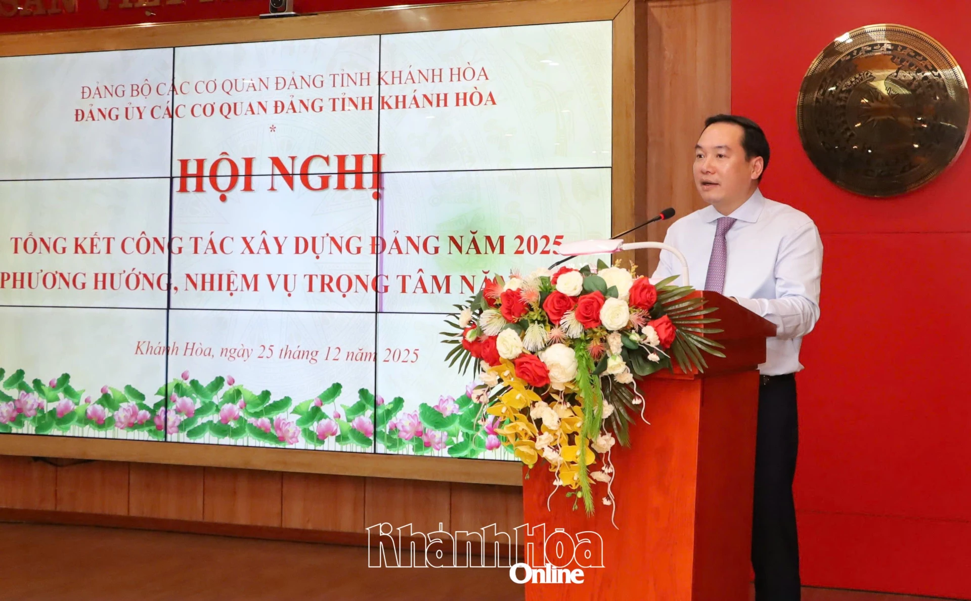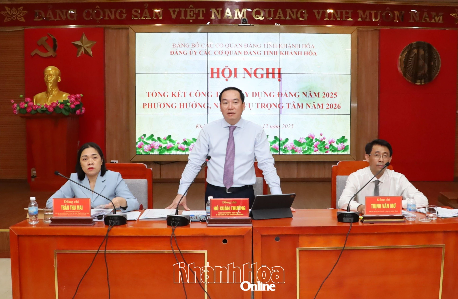Chiều 25-12, Đảng ủy Các cơ quan Đảng tỉnh Khánh Hòa tổ chức Hội nghị tổng kết công tác xây dựng Đảng năm 2025; phương hướng, nhiệm vụ trọng tâm năm 2026. Các đồng chí: Hồ Xuân Trường - Phó Bí thư Thường trực Tỉnh ủy, Bí thư Đảng ủy Các cơ quan Đảng tỉnh; Trần Thu Mai - Ủy viên Ban Thường vụ Tỉnh ủy, Phó Chủ tịch Thường trực Ủy ban MTTQ Việt Nam tỉnh, Phó Bí thư Thường trực Đảng ủy Các cơ quan Đảng tỉnh; Trịnh Văn Mơ - Phó Bí thư chuyên trách Đảng ủy Các cơ quan Đảng tỉnh chủ trì hội nghị.