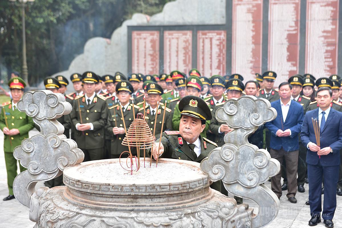 Trong không khí trang nghiêm, đoàn đại biểu thành kính dâng hương, dâng hoa, tưởng nhớ công lao to lớn của Chủ tịch Hồ Chí Minh và tri ân các Anh hùng liệt sĩ CAND đã cống hiến, hy sinh vì sự nghiệp cách mạng, vì độc lập dân tộc và bình yên cuộc sống của nhân dân.