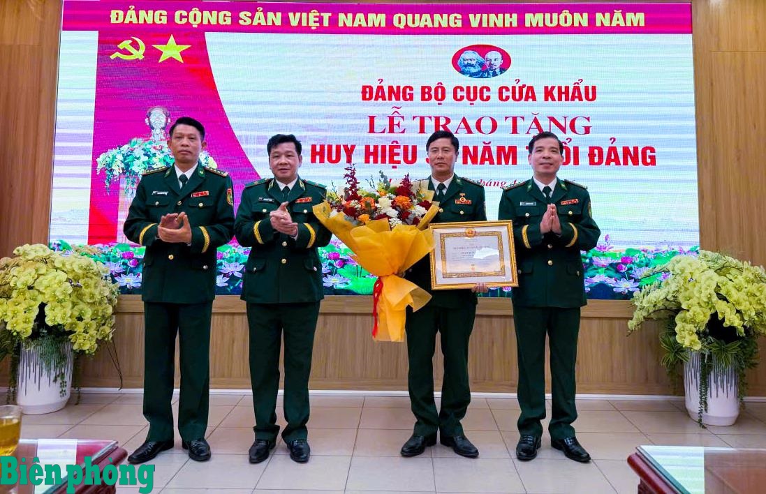 Lãnh đạo Đảng ủy Cục Cửa khẩu Bộ đội Biên phòng trao Huy hiệu 30 năm tuổi Đảng tặng Thượng tá Phạm Quyết Thắng. Ảnh: Xuân Hà