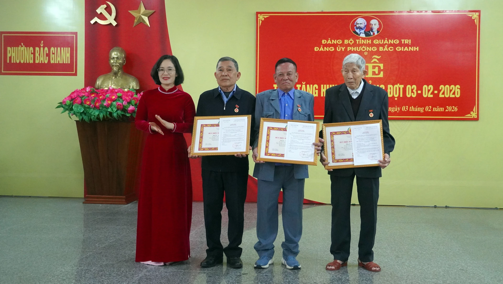 Lãnh đạo Đảng ủy phường Bắc Gianh trao Huy hiệu Đảng cho các đảng viên 45 năm tuổi Đảng - Ảnh: N.M