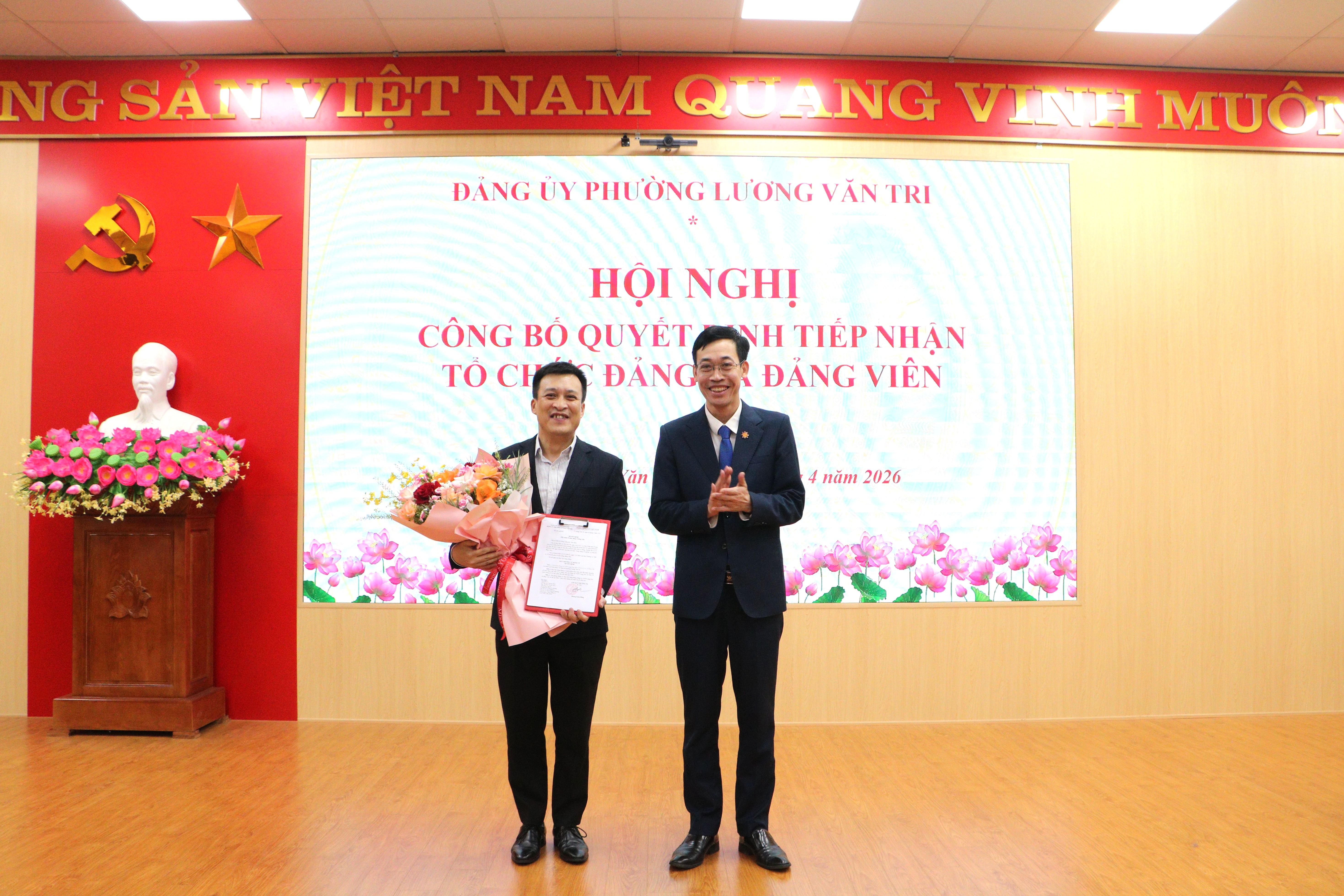 Lãnh đạo Đảng ủy phường Lương Văn Tri trao quyết định và tặng hoa đại diện lãnh đạo Đảng bộ VNPT Lạng Sơn