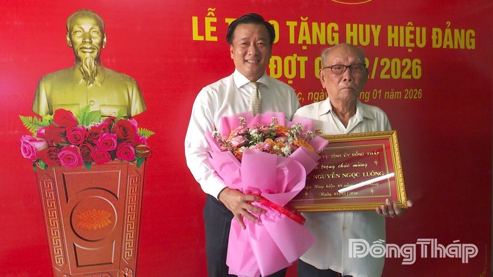Đồng chí Nguyễn Phước Thiện, Bí thư Đảng ủy, Chủ tịch HĐND phường Sa Đéc trao Huy hiệu 65 năm tuổi Đảng cho đảng viên Nguyễn Ngọc Luông.