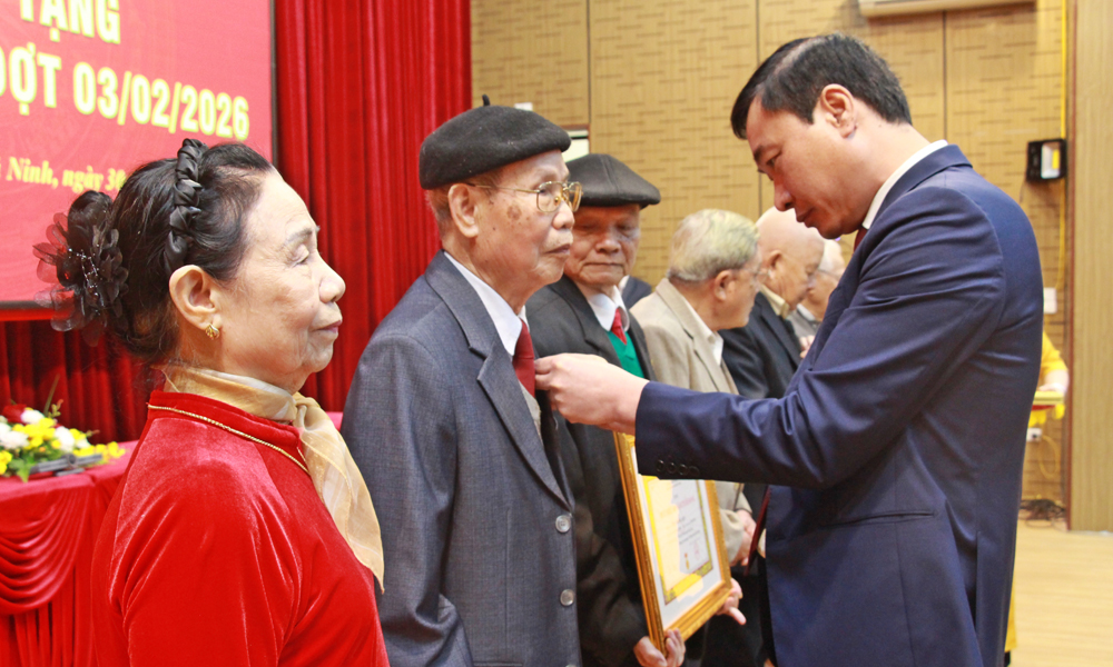 Lãnh đạo Ban Tổ chức Tỉnh ủy và Đảng ủy phường Vũ Ninh trao Huy hiệu 70, 65, 60 năm tuổi Đảng cho các đảng viên.