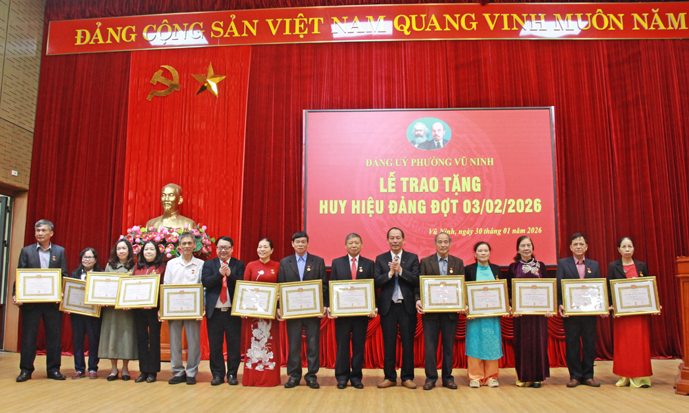 Đợt 3/2, Đảng bộ phường Vũ Ninh vinh dự có 47 đảng viên được nhận Huy hiệu Đảng. Trong đó, 2 đảng viên 70 năm tuổi Đảng; 2 đảng viên 65 năm tuổi Đảng; 6 đảng viên 60 năm tuổi Đảng; 4 đảng viên 55 năm tuổi Đảng; 5 đảng viên 50 năm tuổi Đảng; 13 đảng viên 45 năm tuổi Đảng; 8 đảng viên 40 năm tuổi Đảng; 7 đảng viên 30 năm tuổi Đảng.