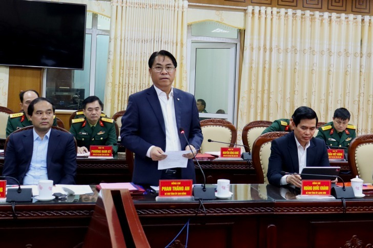 Đồng chí Phan Thăng An, Bí thư Tỉnh ủy, Bí thư Đảng ủy Quân sự tỉnh phát biểu thảo luận tại hội nghị.