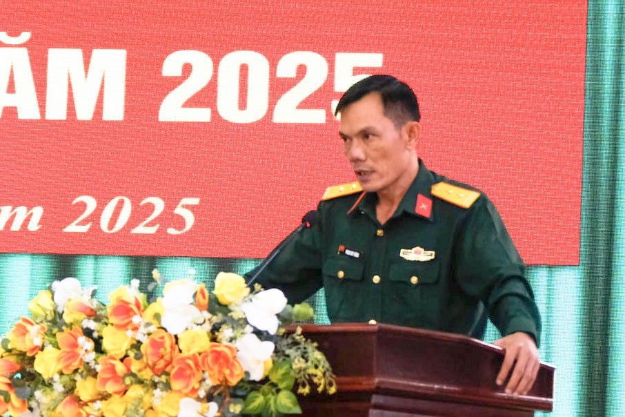 Đại tá Lê Anh Vương, Phó Chỉ huy trưởng, Tham mưu trưởng Bộ CHQS tỉnh trình bày báo cáo tóm tắt kết quả thực hiện nhiệm vụ quân sự, quốc phòng năm 2025