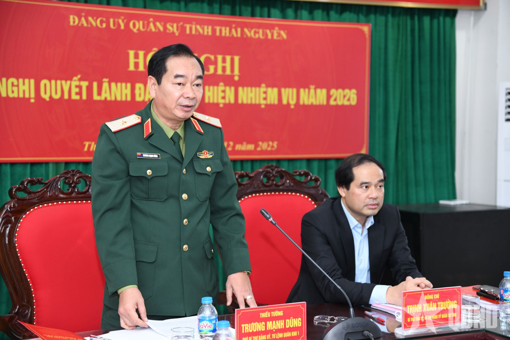 Phát biểu chỉ đạo tại hội nghị, Thiếu tướng Trương Mạnh Dũng, Phó bí thư Đảng ủy, Tư lệnh Quân khu 1 nhấn mạnh, năm 2026, Đảng bộ Quân sự tỉnh Thái Nguyên tiếp tục lãnh đạo toàn diện mọi nhiệm vụ của LLVT địa phương, trọng tâm là nhiệm vụ diễn tập khu vực phòng thủ cấp tỉnh; sẵn sàng ứng phó với những thách thức an ninh phi truyền thống như thiên tai, bão, lũ, sạt lở đất, cháy nổ, cháy rừng; bảo đảm tuyệt đối an toàn các sự kiện chính trị lớn của tỉnh và đất nước.