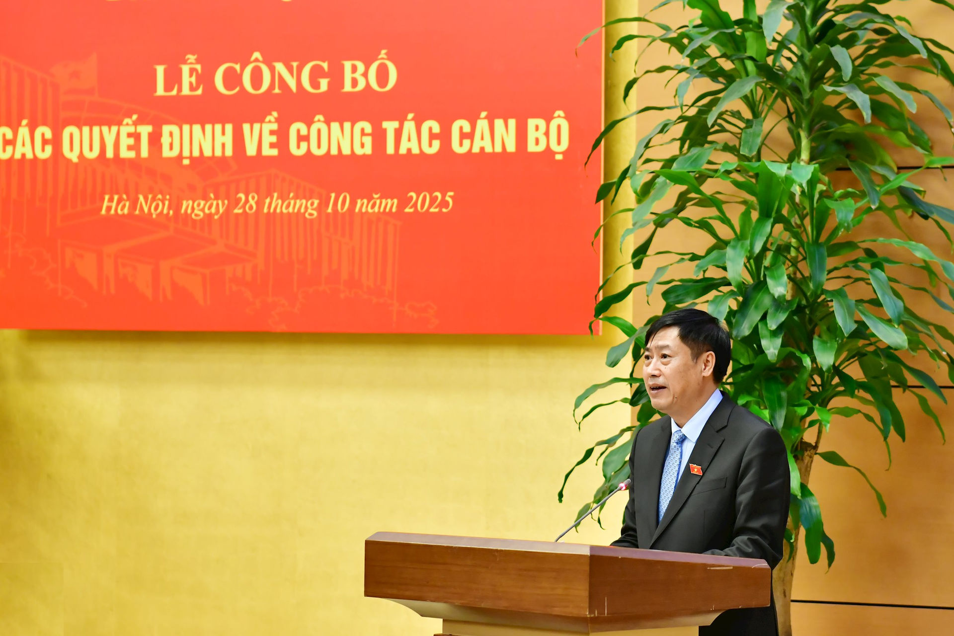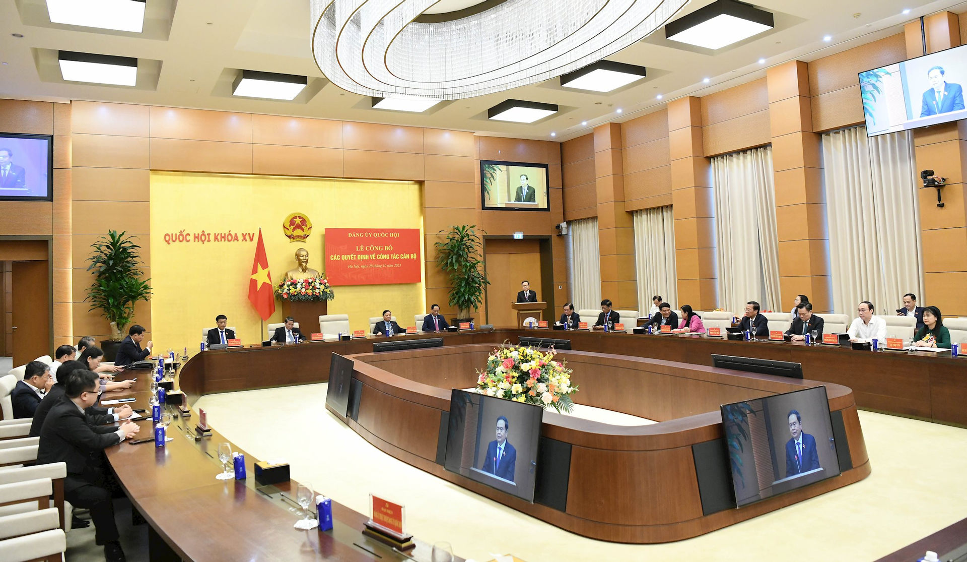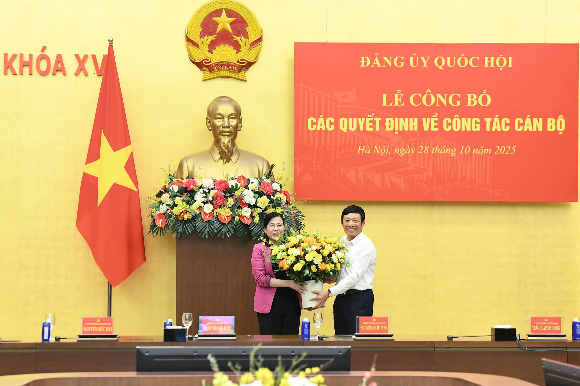Thay mặt Đảng ủy Quốc hội, Bí thư Đảng ủy Quốc hội, Chủ tịch Quốc hội Trần Thanh Mẫn đã trao các quyết định; Phó Bí thư Đảng ủy Quốc hội, Phó Chủ tịch Quốc hội Nguyễn Khắc Định tặng hoa chúc mừng các đồng chí được bổ nhiệm.