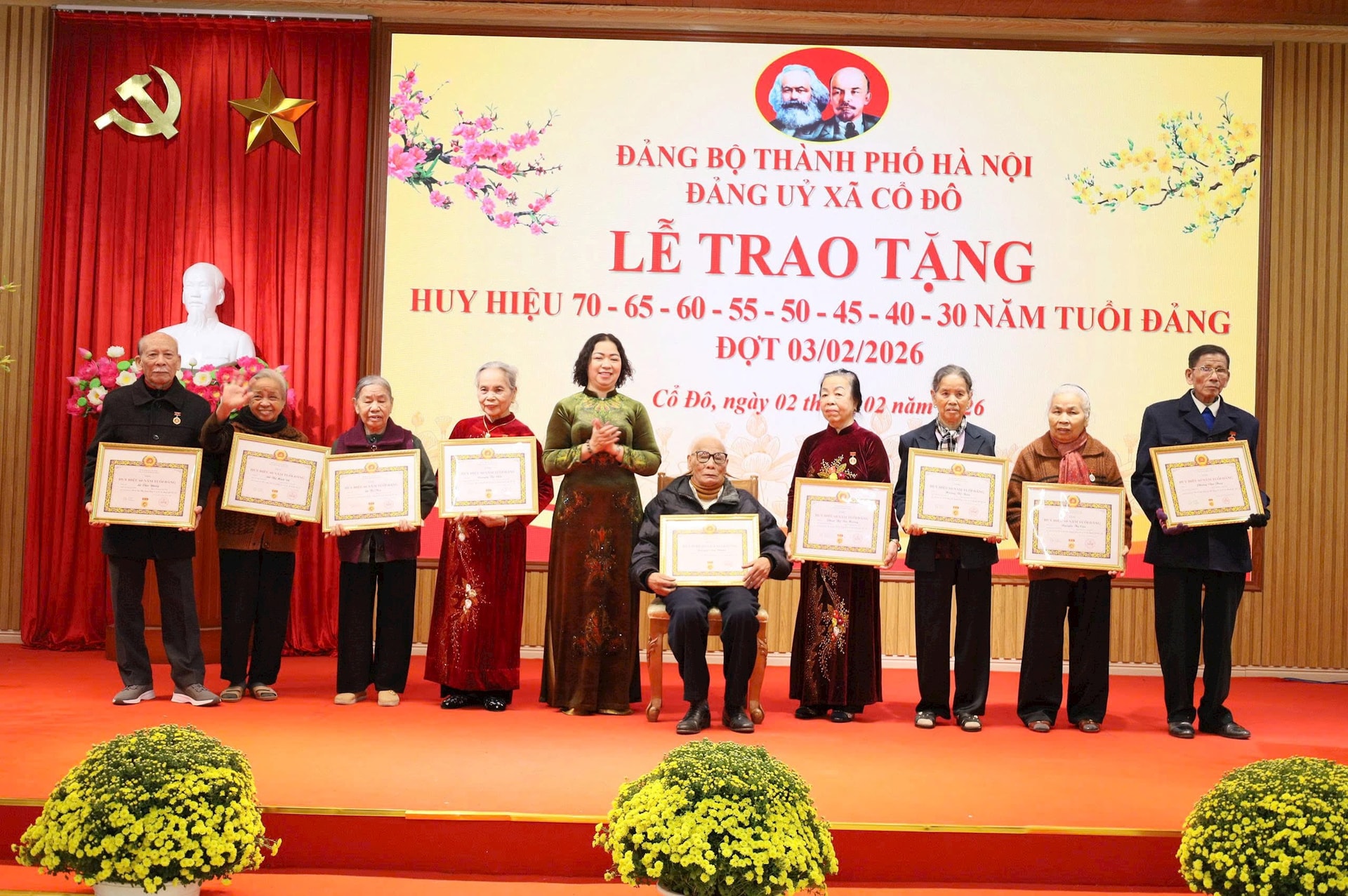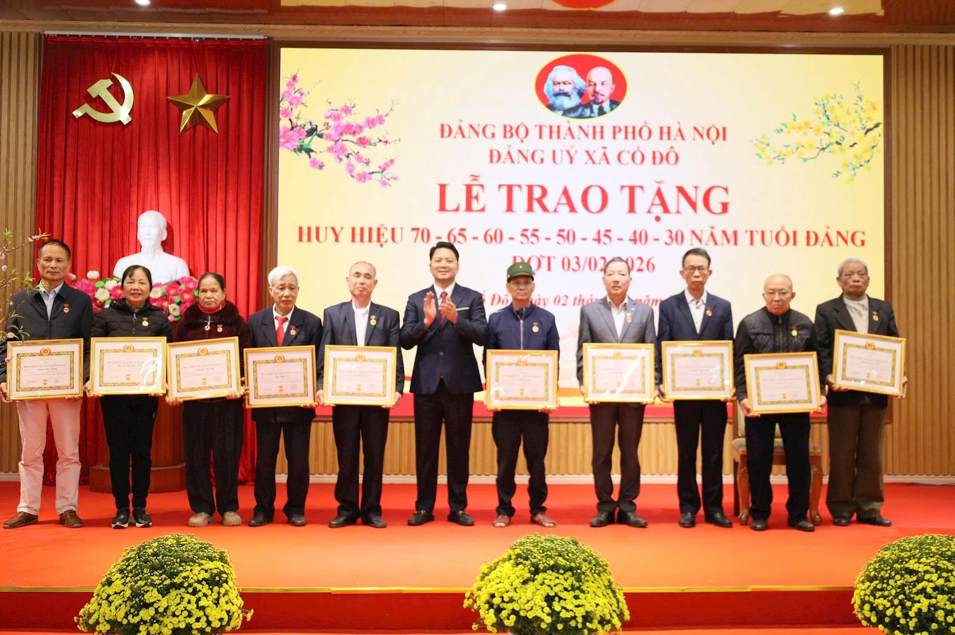 Theo Quyết định của Ban Thường vụ Thành ủy Hà Nội, Đảng bộ xã Cổ Đô có 60 đồng chí được trao Huy hiệu Đảng đợt 3-2; trong đó có 1 đồng chí được nhận Huy hiệu 70 năm tuổi Đảng, 2 đồng chí 65 năm tuổi Đảng, 18 đồng chí được nhận Huy hiệu 60 năm tuổi Đảng, 9 đồng chí được nhận Huy hiệu 55 năm tuổi Đảng, 2 đồng chí được nhận Huy hiệu 50 năm tuổi Đảng, 10 đồng chí được nhận Huy hiệu 45 năm tuổi Đảng, 14 đồng chí được nhận Huy hiệu 40 năm tuổi Đảng và 4 đồng chí được nhận Huy hiệu 30 năm tuổi Đảng.