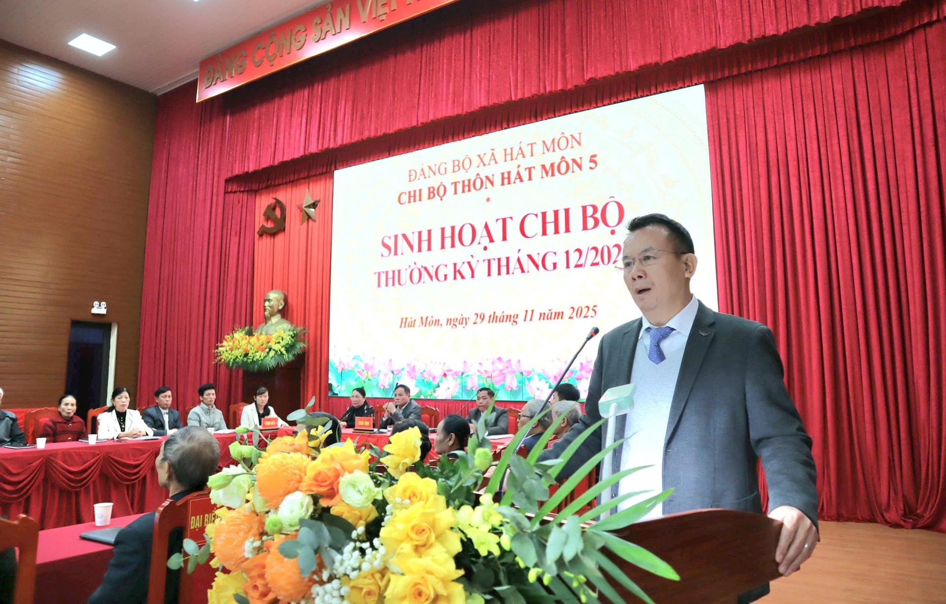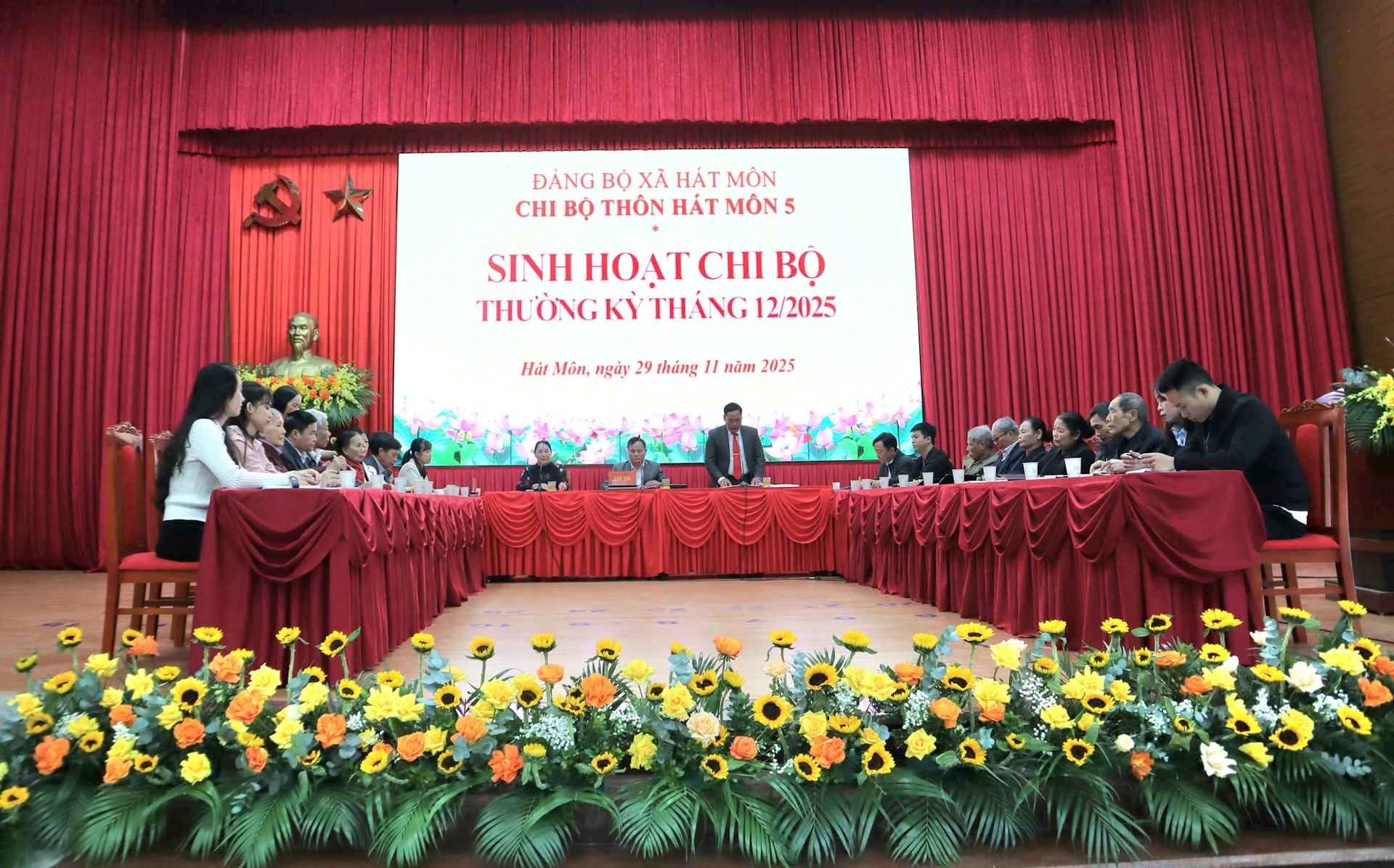 Buổi sinh hoạt chi bộ “mẫu” của Chi bộ thôn Hát Môn 5 bắt đầu lúc 8h và kéo dài trong khoảng hai giờ đồng hồ, bảo đảm đầy đủ các bước theo quy định. Phó Bí thư Chi bộ Nguyễn Hoàng Tú chủ trì phần mở đầu, tuyên bố lý do, giới thiệu đại biểu, thông báo tình hình đảng phí, phân công thư ký, triển khai biểu quyết và điểm danh đảng viên. Theo đó, Chi bộ thôn Hát Môn 5 có 28 đảng viên, trong đó 20 đảng viên sinh hoạt thường xuyên và 8 đảng viên miễn sinh hoạt do tuổi cao; buổi sinh hoạt có 25 đồng chí dự, bao gồm cả đảng viên miễn sinh hoạt, thể hiện tinh thần trách nhiệm cao.