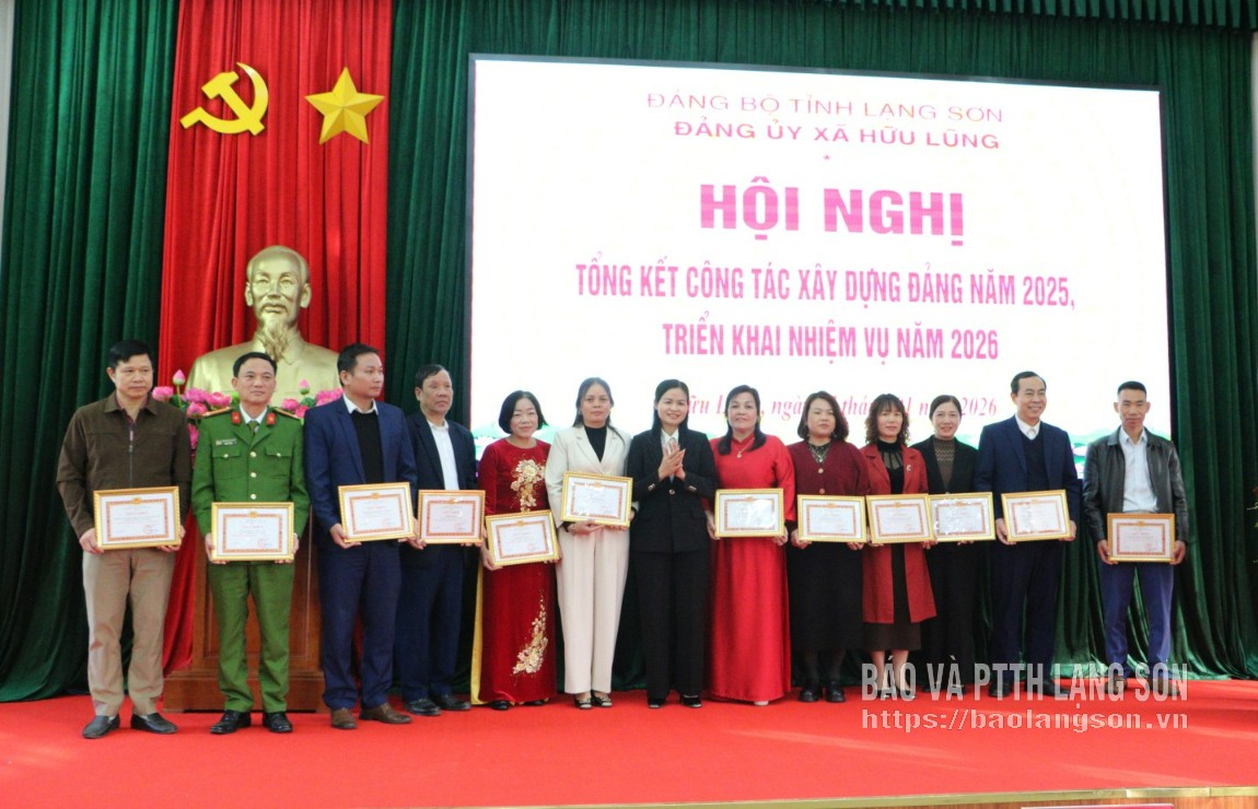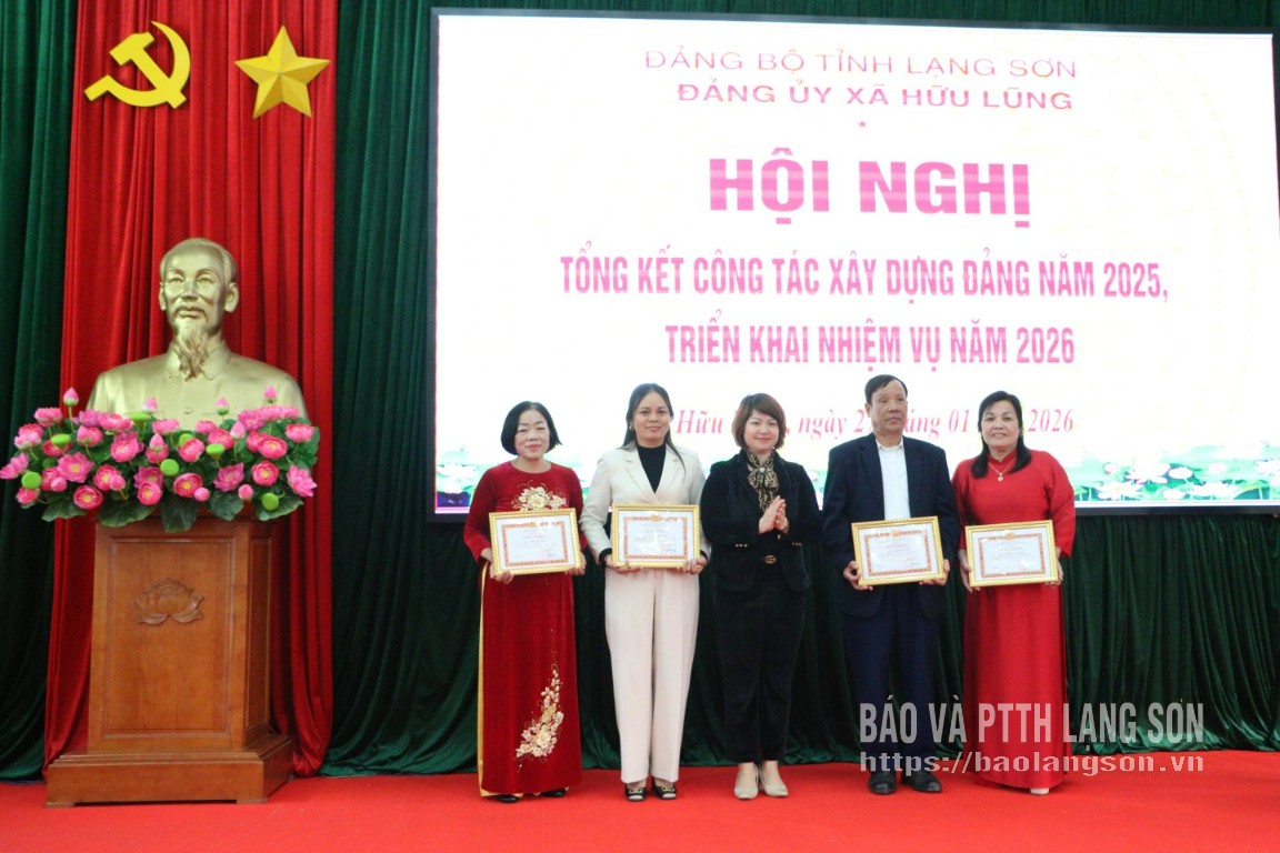 Lãnh đạo Đảng ủy xã Hữu Lũng tặng giấy khen cho các đảng viên đạt tiêu chuẩn “Hoàn thành xuất sắc nhiệm vụ” năm 2025.