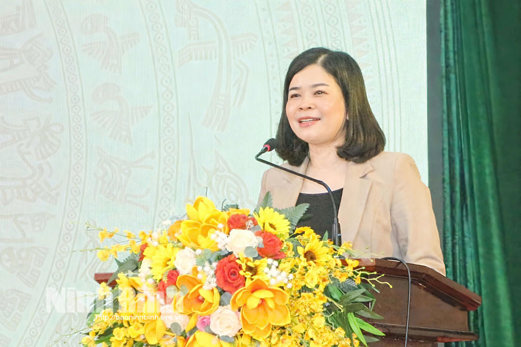 Đồng chí Phạm Thị Thu Hằng, Ủy viên Ban Thường vụ Tỉnh ủy, Giám đốc Báo và phát thanh, truyền hình Ninh Bình phát biểu tại hội nghị.