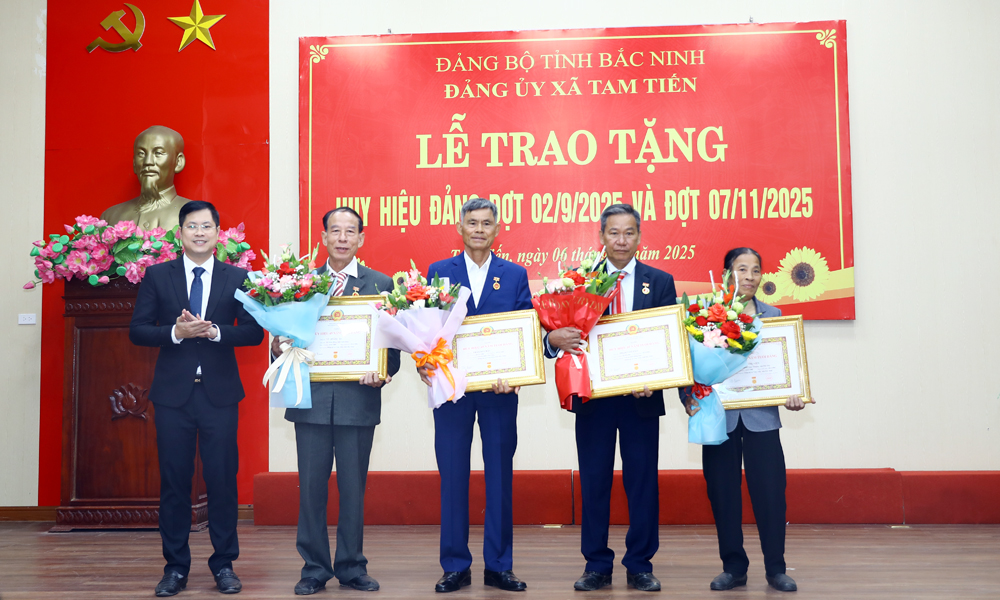 Tại buổi lễ, Đảng ủy xã công bố quyết định của Ban Thường vụ Tỉnh ủy trao tặng Huy hiệu Đảng dịp 2/9 và 7/11/2025 cho tổng số 15 đảng viên thuộc Đảng bộ xã Tam Tiến. Trong số này, có 2 đồng chí 55 năm tuổi Đảng, 1 đồng chí 50 năm tuổi Đảng, 5 đồng chí 45 năm tuổi Đảng, 3 đồng chí 40 năm tuổi Đảng và 4 đồng chí 30 năm tuổi Đảng.