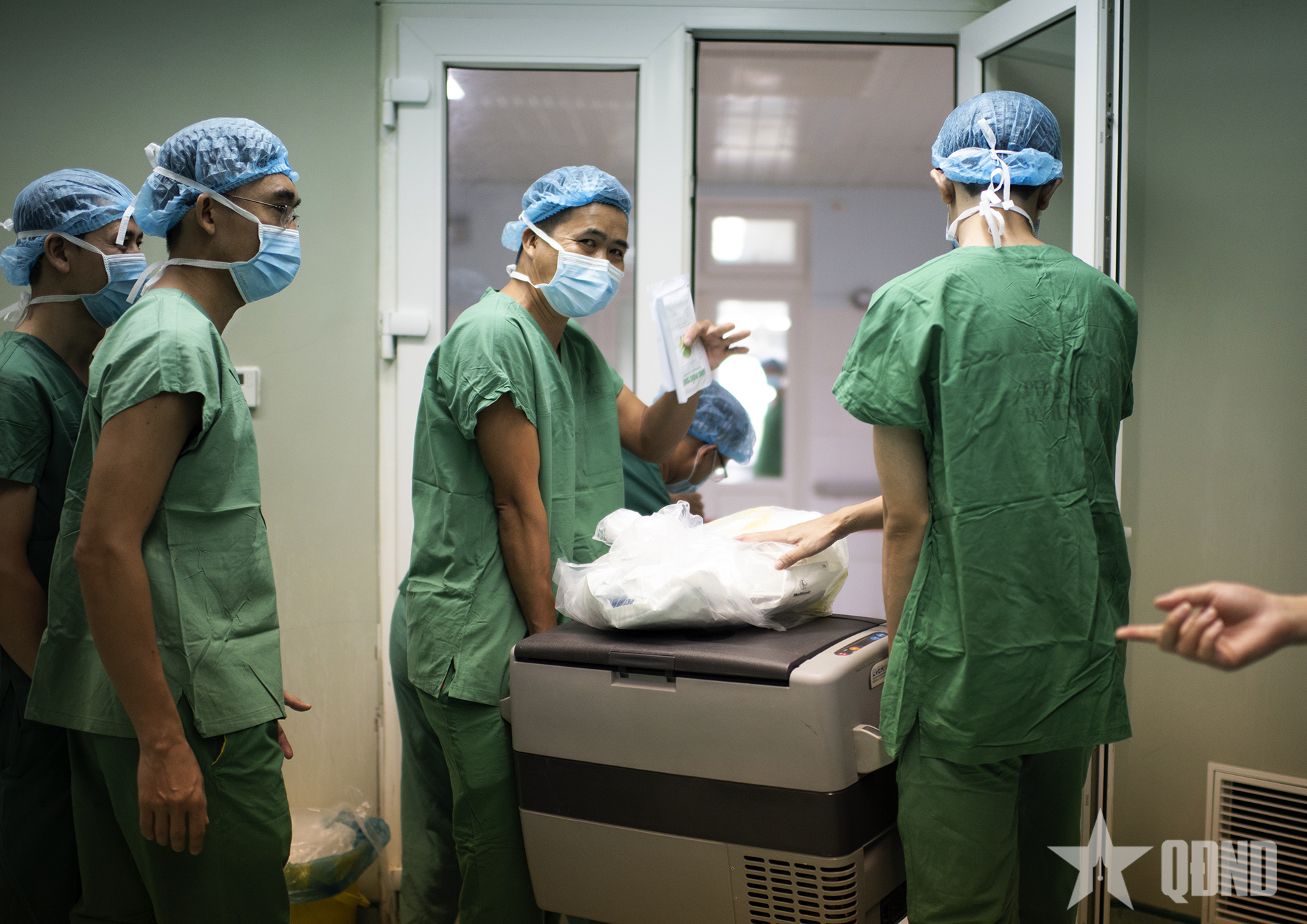 Đội ngũ y, bác sĩ vận chuyển tạng của người hiến bằng thiết bị chuyên dụng.