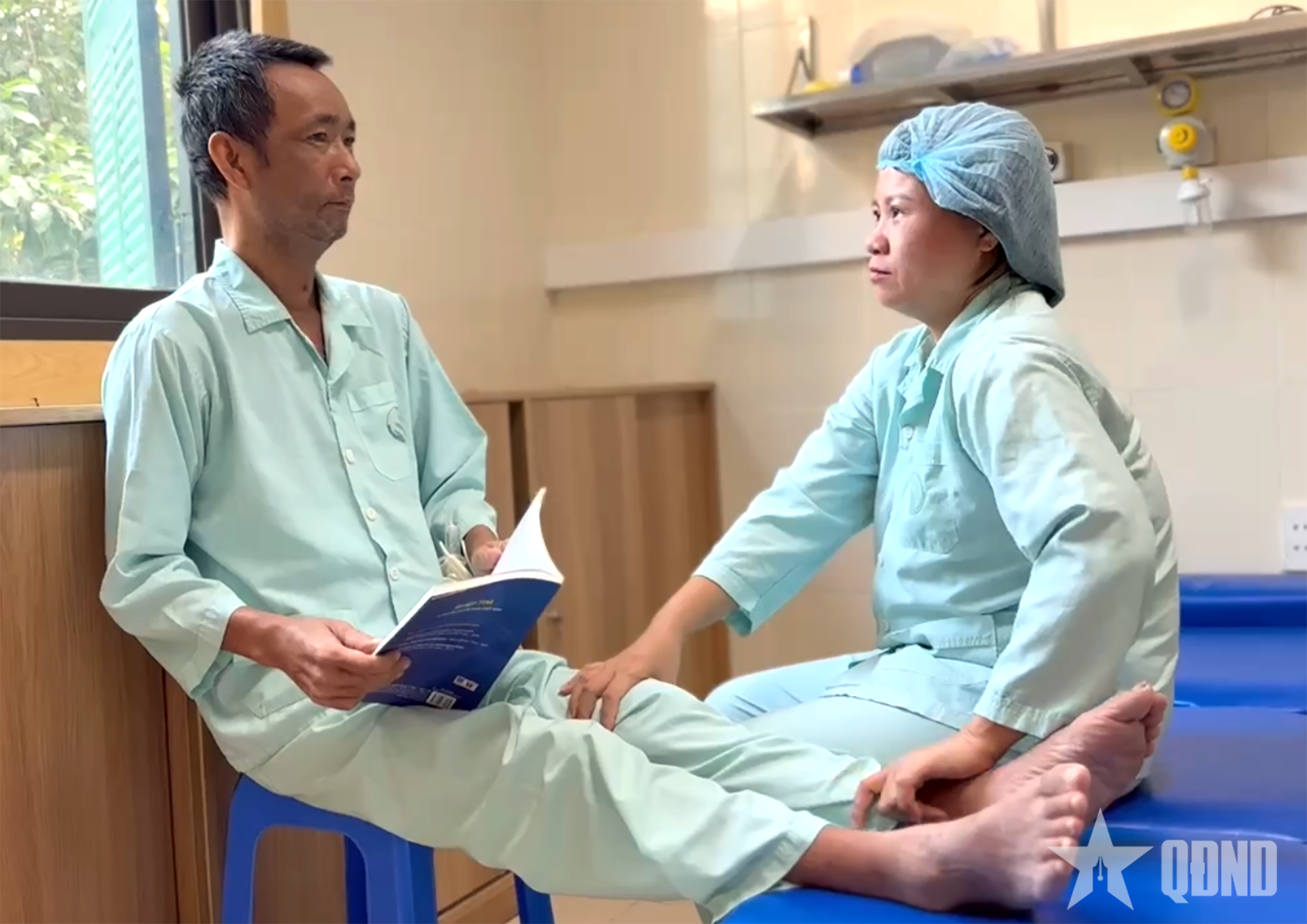 Niềm vui của người vợ khi chồng hồi phục nhanh chóng sau ca ghép tạng. Trong ảnh: Bệnh nhân Nguyễn Văn Hòa được thực hiện ghép tim, gan đồng thời.
