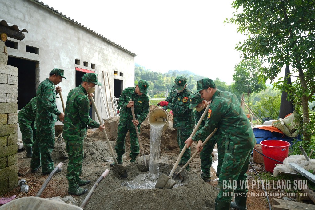 Cán bộ, chiến sĩ Đồn Biên phòng Bảo Lâm giúp dân xây dựng nhà ở