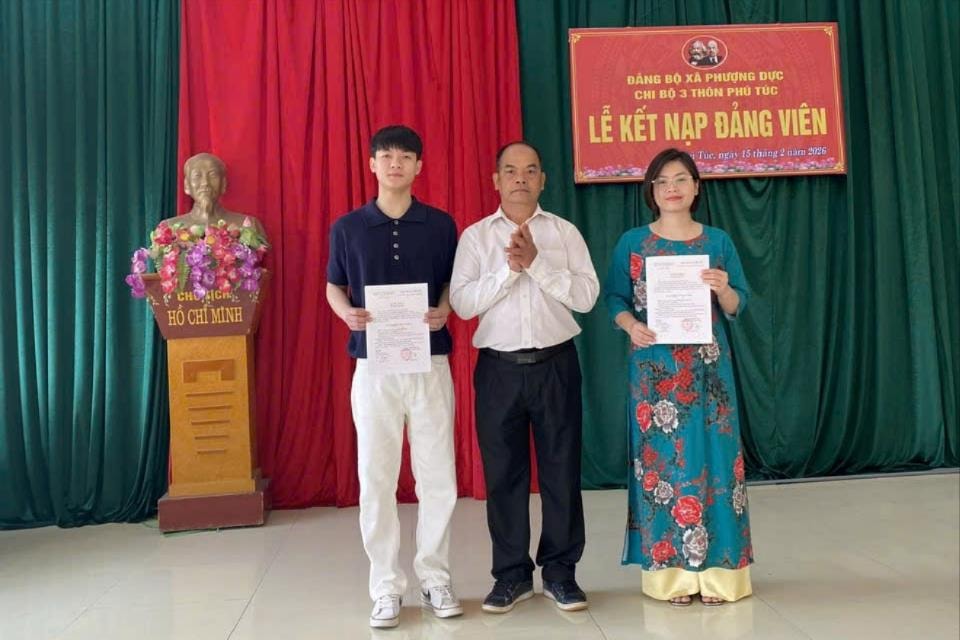 Nguyễn Trí Trung (bên trái) vinh dự được kết nạp Đảng trước ngày lên đường nhập ngũ. Ảnh: VT