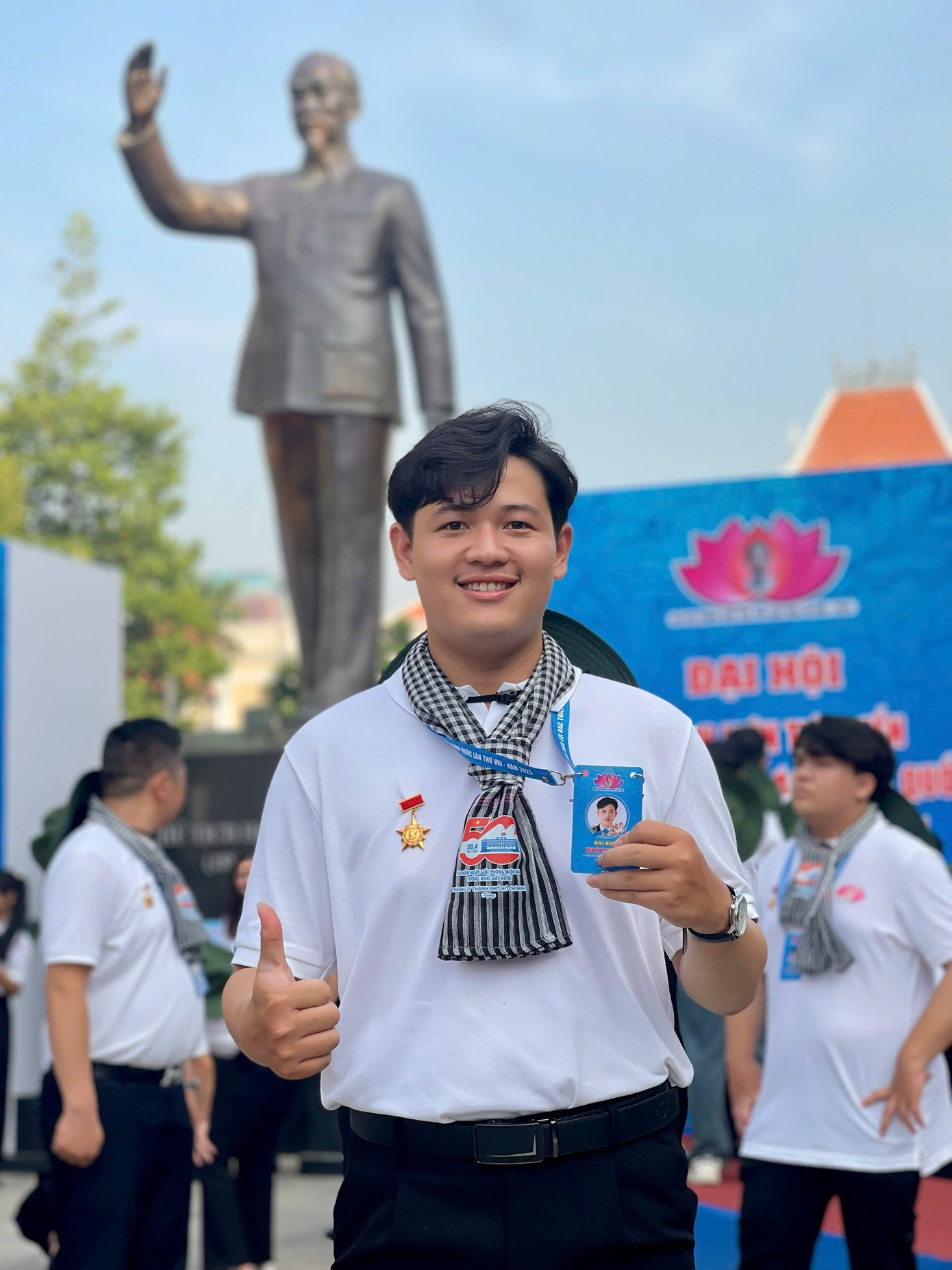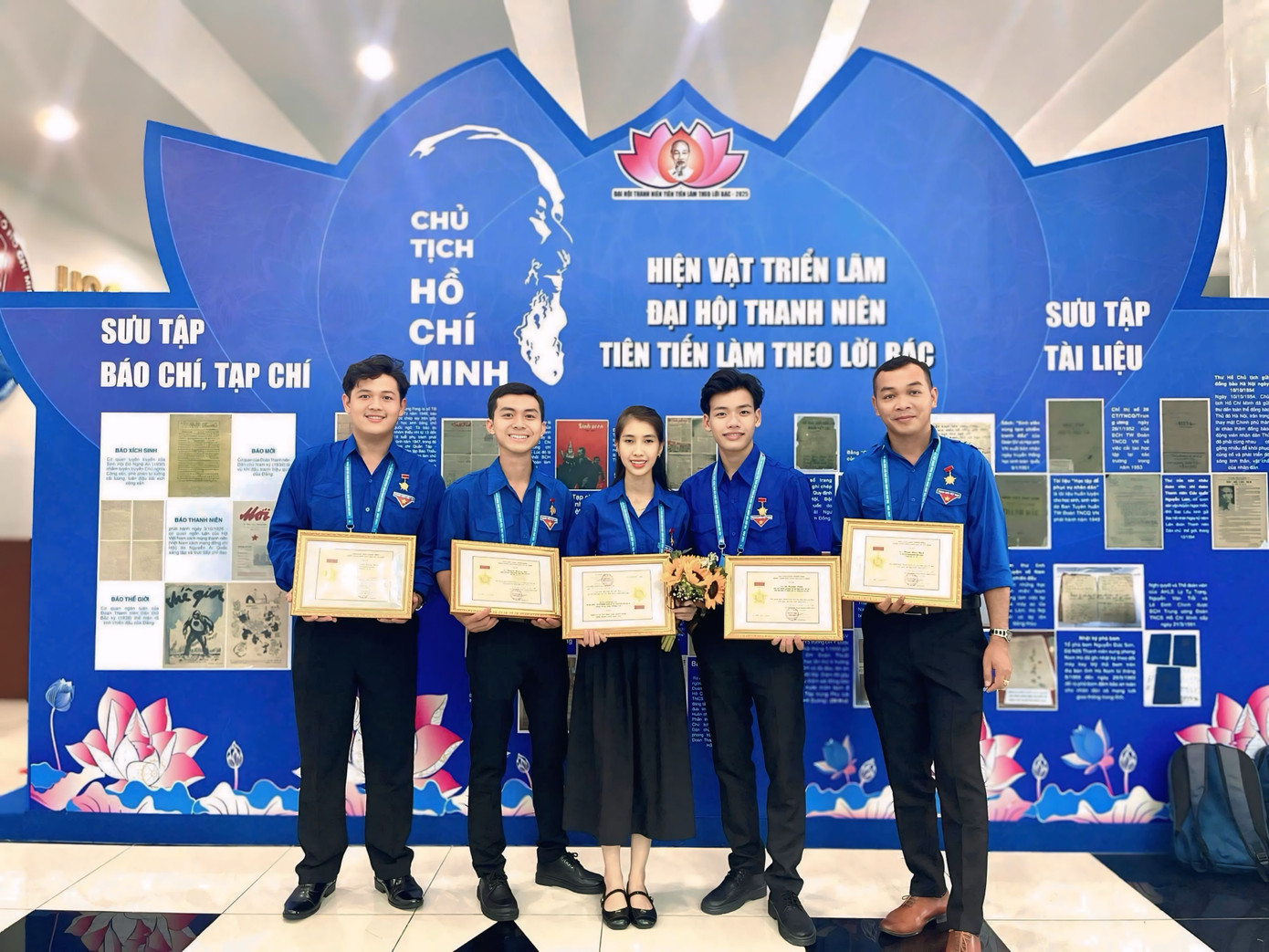 Nguyễn Trọng Hiếu (ngoài cùng bên trái) rạng rỡ trong lễ tuyên dương danh hiệu “Thanh niên tiên tiến làm theo lời Bác” toàn quốc lần thứ VIII năm 2025.