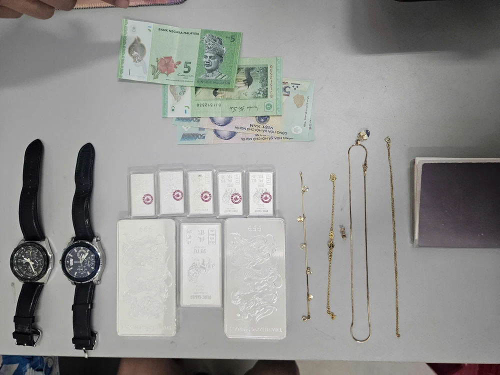 Cảnh sát thu giữ tang vật gồm tám thỏi bạc, ba lắc vàng, một dây chuyền vàng, một chiếc bông tai vàng và hai đồng hồ.