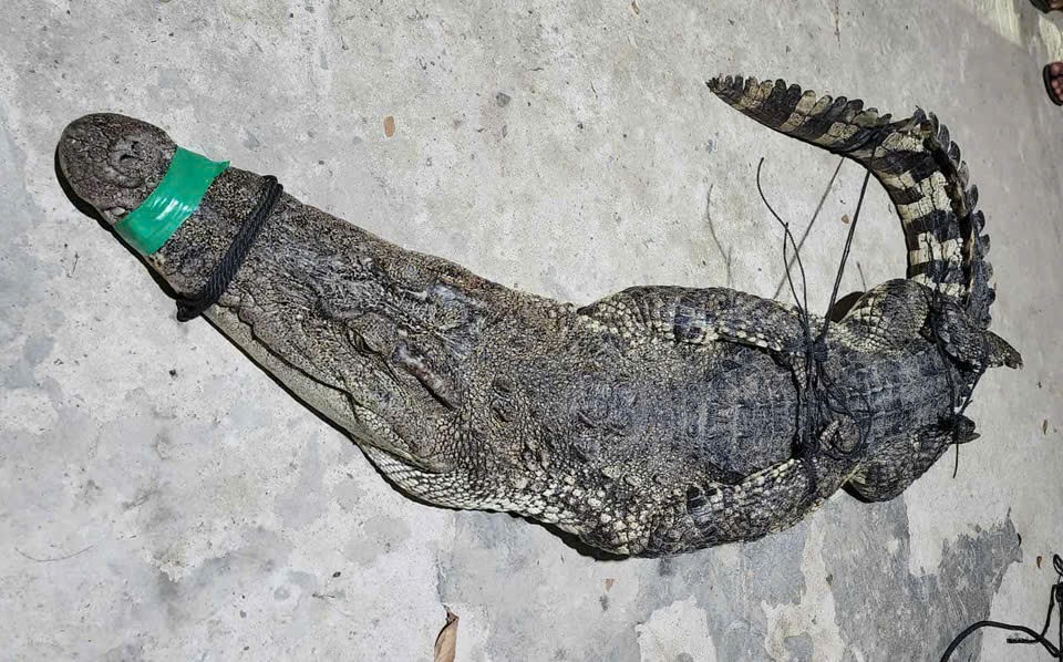 Anh Chuyển cho biết, khoảng 21 giờ 50 phút ngày 12-11, trong lúc đánh bắt cá trên sông Cái Cỏ, đoạn giáp ranh biên giới Campuchia thì phát hiện vật thể lớn mắc vào lưới. Khi kéo lên, anh nhận thấy đó là một con cá sấu trưởng thành, thân dài, trọng lượng khoảng 37kg.