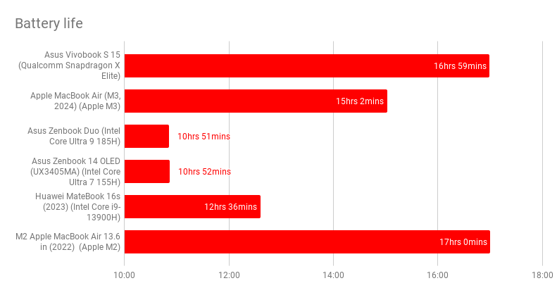 Ưu điểm lớn nhất của Vivobook S 15 chính là khả năng quản lý điện năng. Trong bài kiểm tra thực tế, máy trụ được 16 giờ 59 phút, dài hơn 2 giờ so với MacBook Air 13 inch M3. Đây là kỷ lục mới cho các dòng laptop chạy Windows hiện nay.