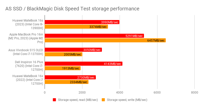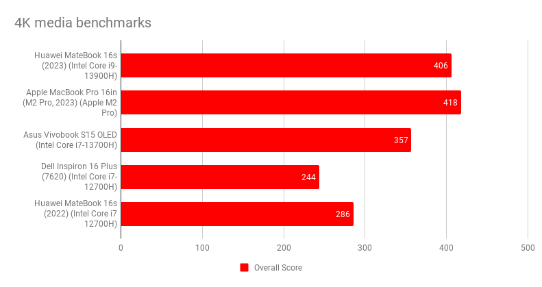 Sức mạnh của MateBook 16s (2023) đến từ vi xử lý Intel Core i9-13900H 14 nhân, có thể đạt tốc độ tối đa 5.4GHz. Trong các bài kiểm tra, máy cho thấy sự cải thiện hiệu năng rõ rệt, cao hơn 42% so với thế hệ trước dùng chip Core i7-12700H. Điểm số Cinebench R23 đạt 2.034 (đơn lõi) và 16.211 (đa lõi), khẳng định khả năng xử lý các tác vụ nặng một cách nhanh chóng.