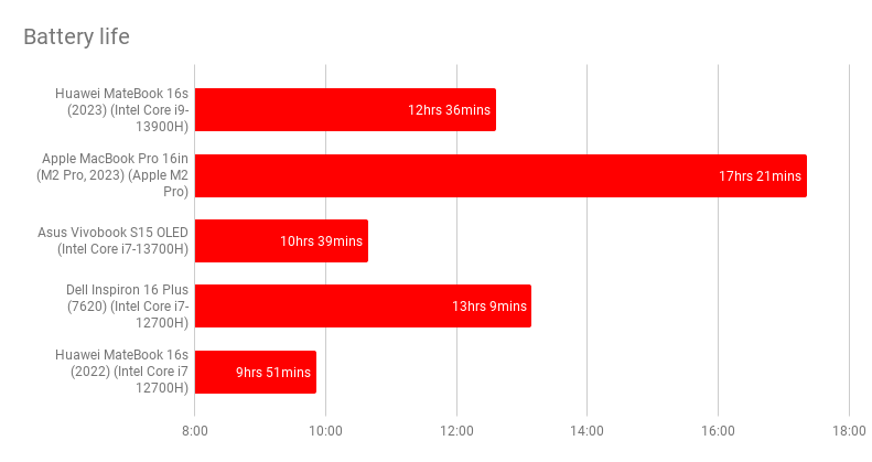 Dù sở hữu CPU mạnh hơn, thời lượng pin của MateBook 16s (2023) lại được cải thiện đáng kể. Với cùng viên pin 84Wh, máy có thể hoạt động liên tục trong 12 giờ 36 phút khi xem video, lâu hơn gần 2 giờ 45 phút so với thế hệ trước, cho thấy sự tối ưu hóa hệ thống rất tốt của Huawei.