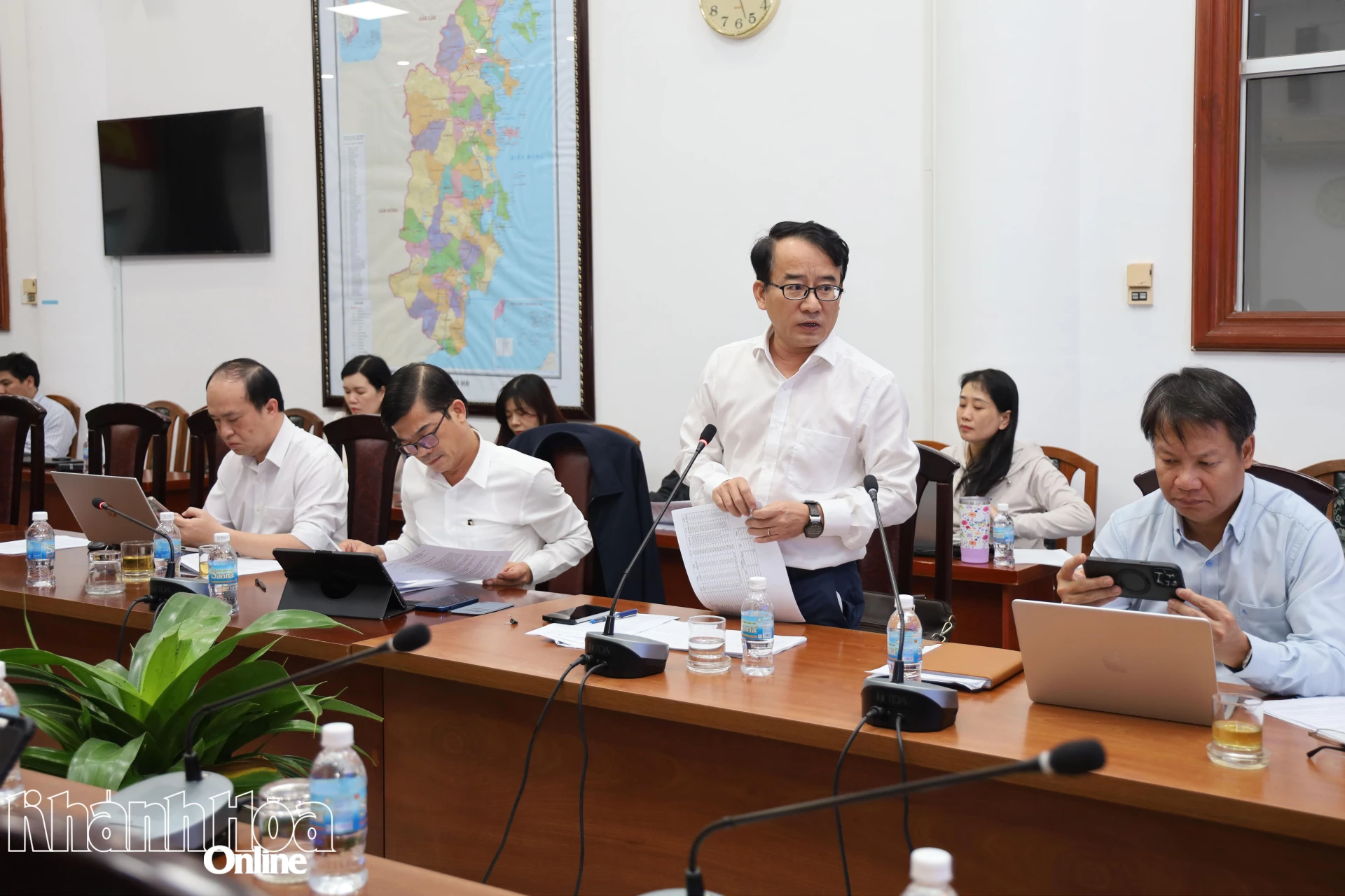 Giám đốc Sở Nội vụ Võ Chí Vương báo cáo tại cuộc họp.