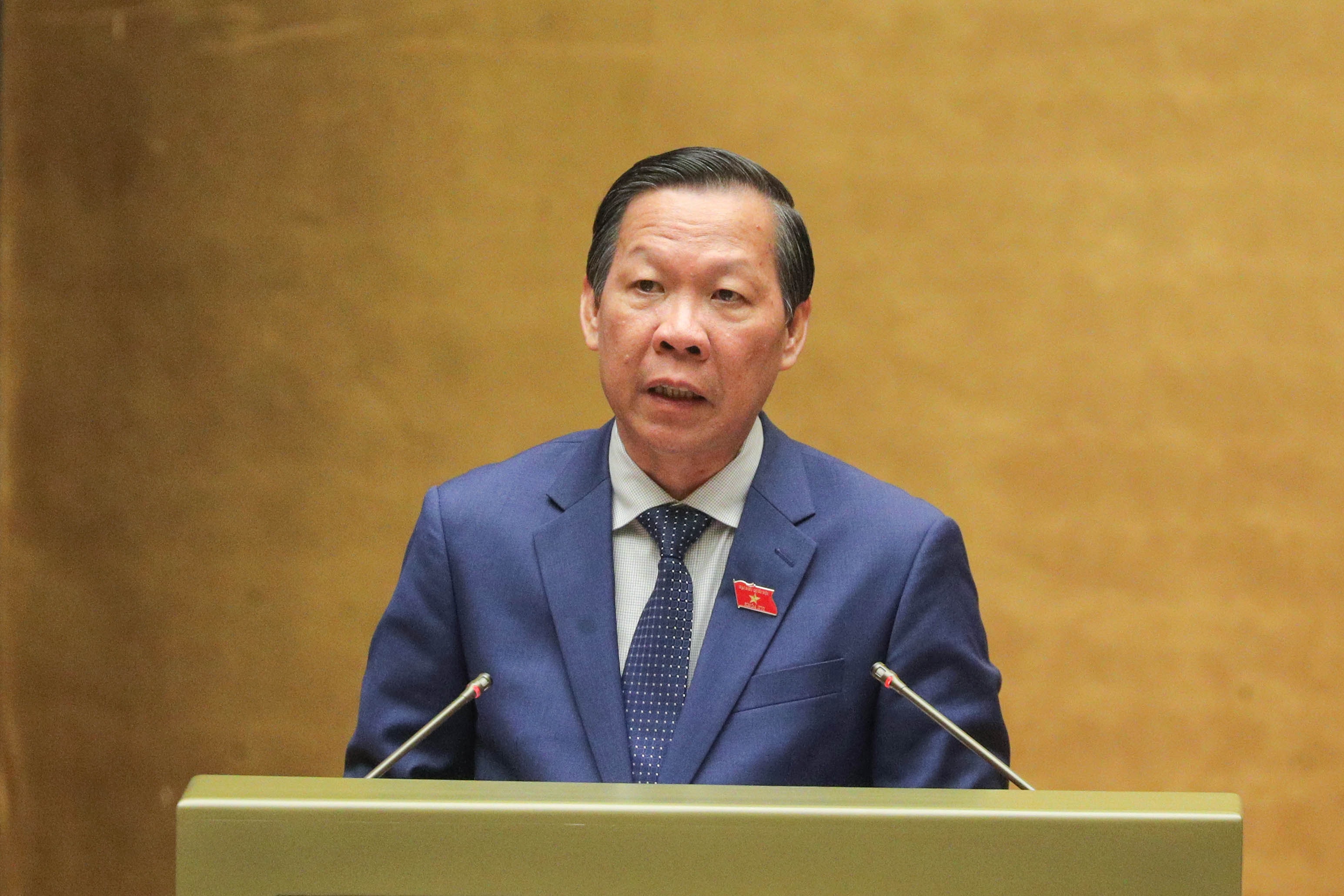 Chủ nhiệm Ủy ban Kinh tế và Tài chính Phan Văn Mãi trình bày Báo cáo thẩm tra dự thảo Nghị quyết. Ảnh: Hồ Long