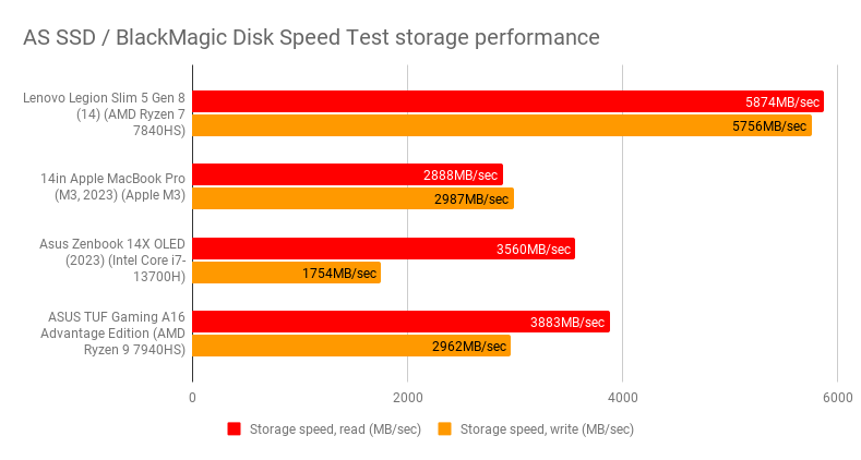 Ổ cứng SSD SKHynx 1TB cho tốc độ đọc và ghi tuần tự rất cao, lần lượt là 5.874MB/giây và 5.756MB/giây. Máy cũng có một khe cắm M.2 thứ hai để người dùng có thể nâng cấp dung lượng lưu trữ. Một điểm cần lưu ý là RAM được hàn chết trên bo mạch chủ.